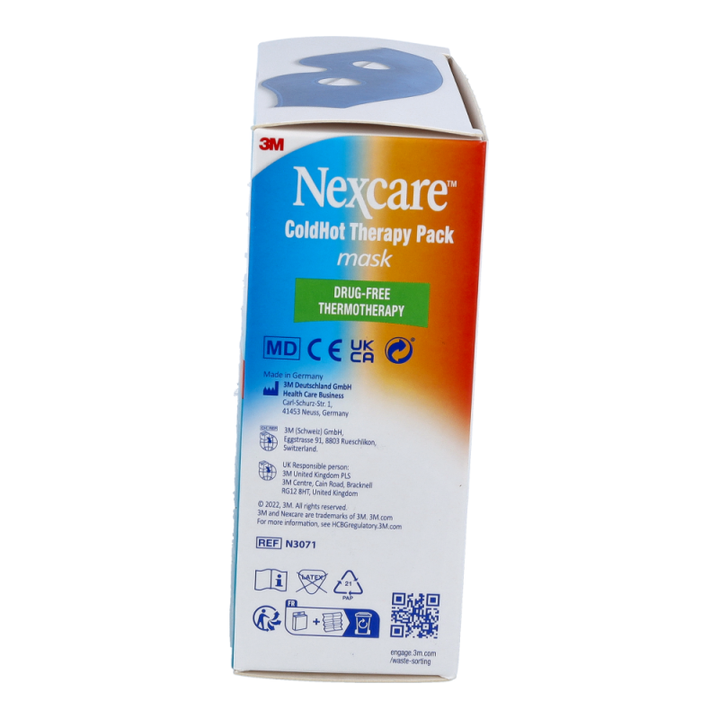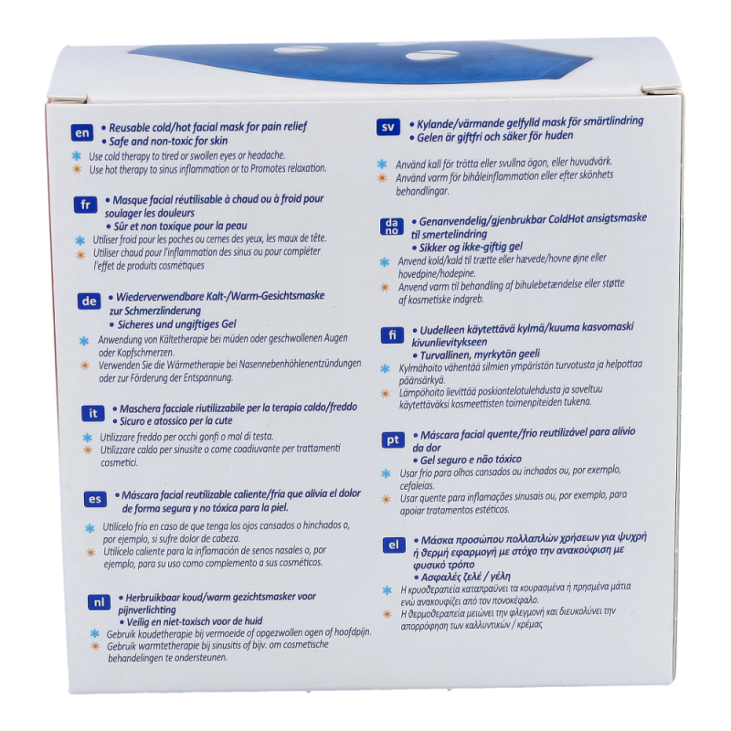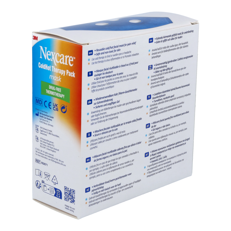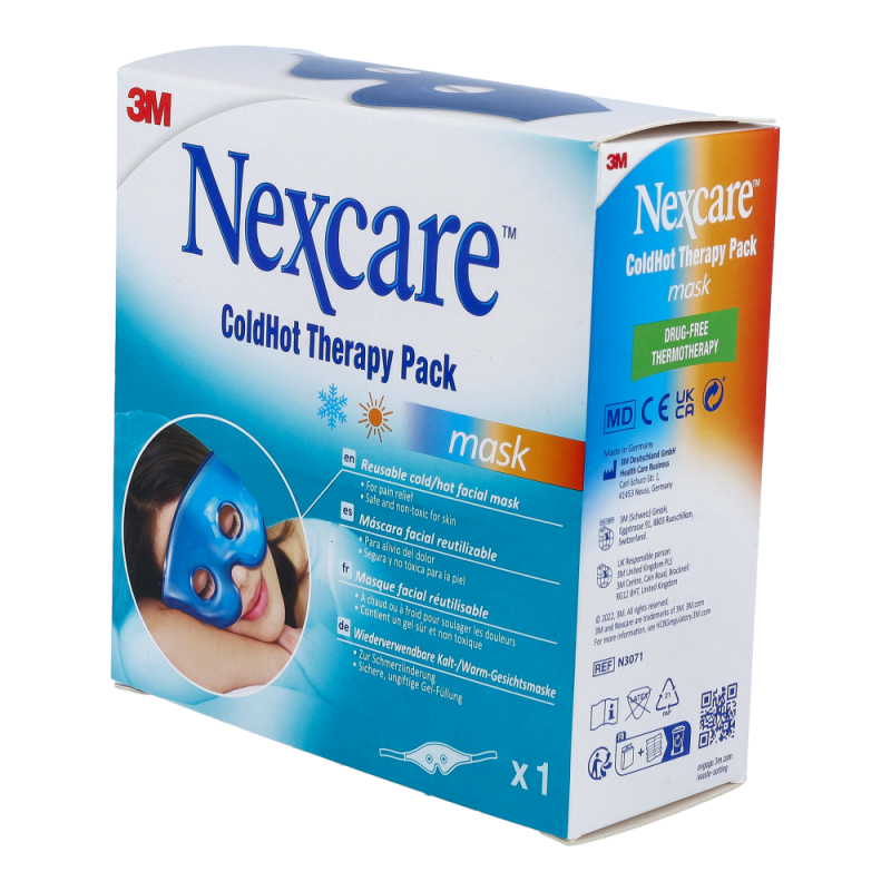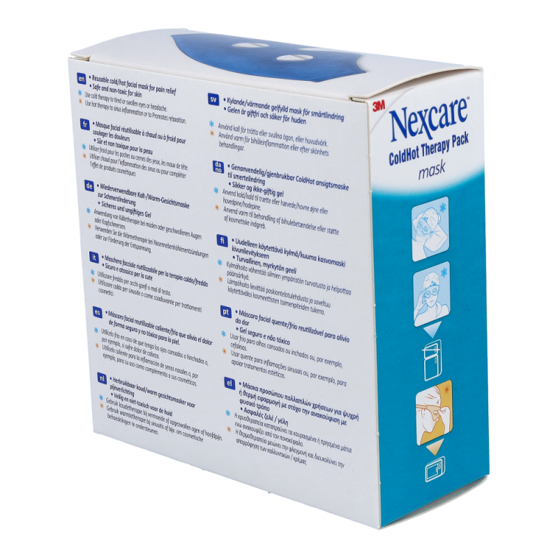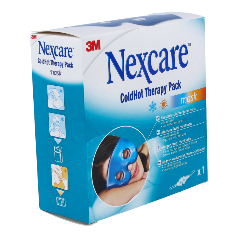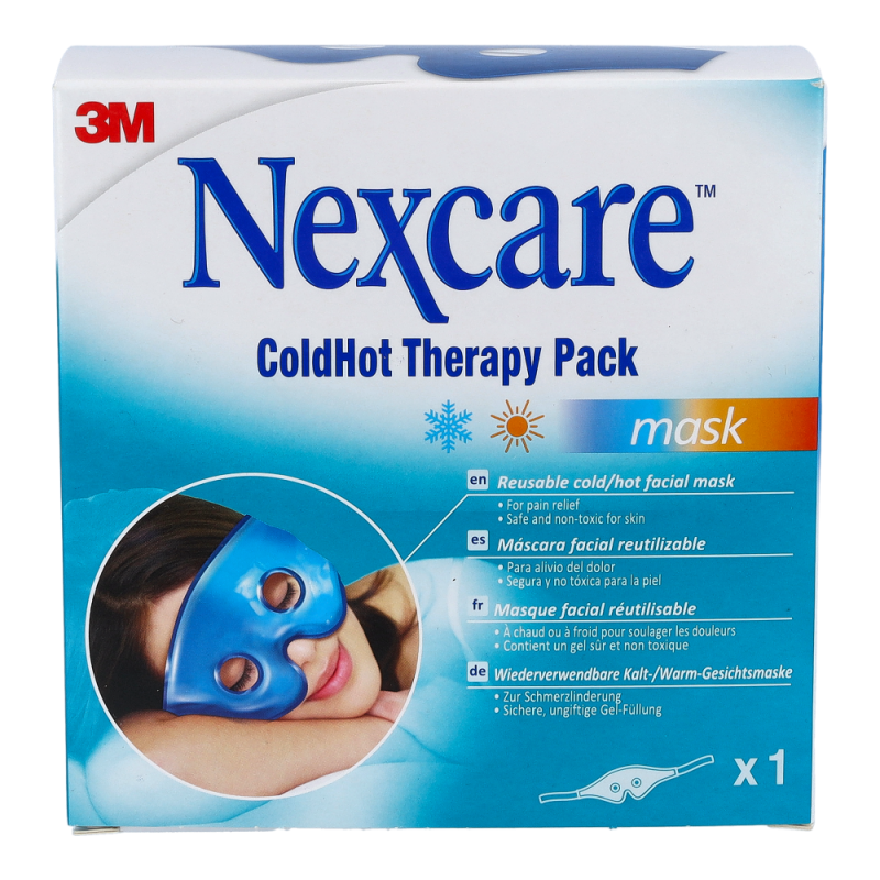 Nexcare ColdHot™ Maske ist die wiederverwendbare Gesichtsmaske für therapeutischen und kosmetischen Einsatz. Die samtweiche Oberfläche der Maske sorgt für hohen Tragekomfort. Das extra-große Format erlaubt Behandlung von Stirn, Augen-Partie sowie Akupunktur-Punkten an der Schläfe.