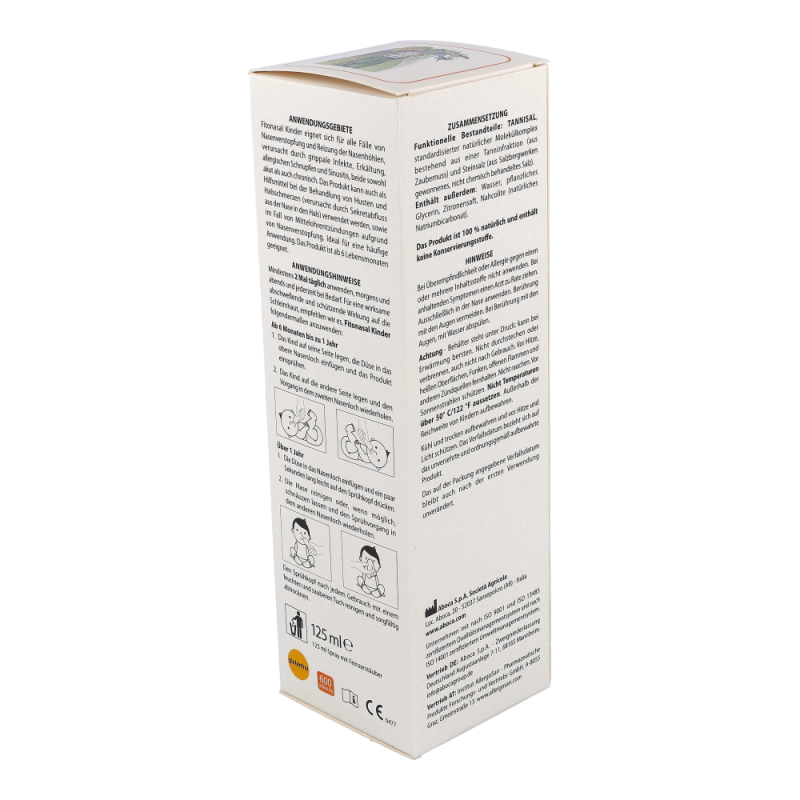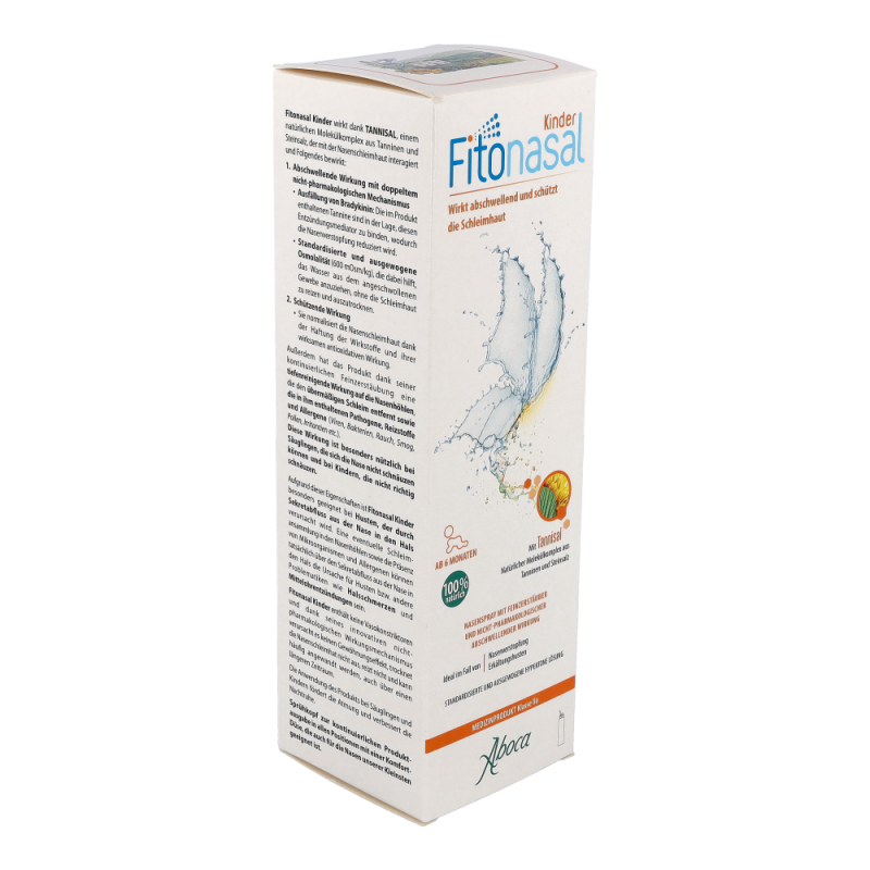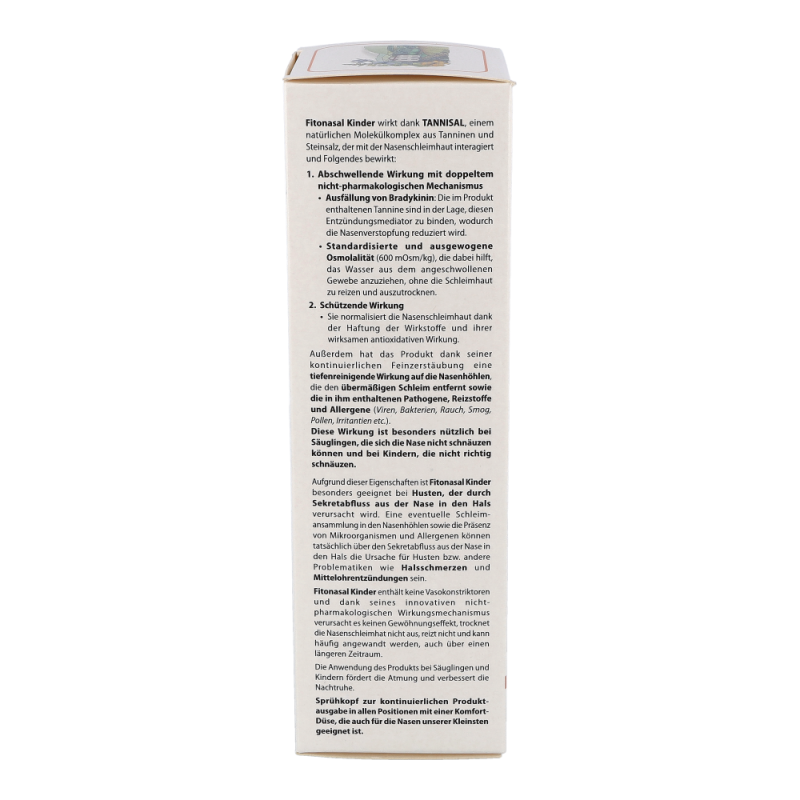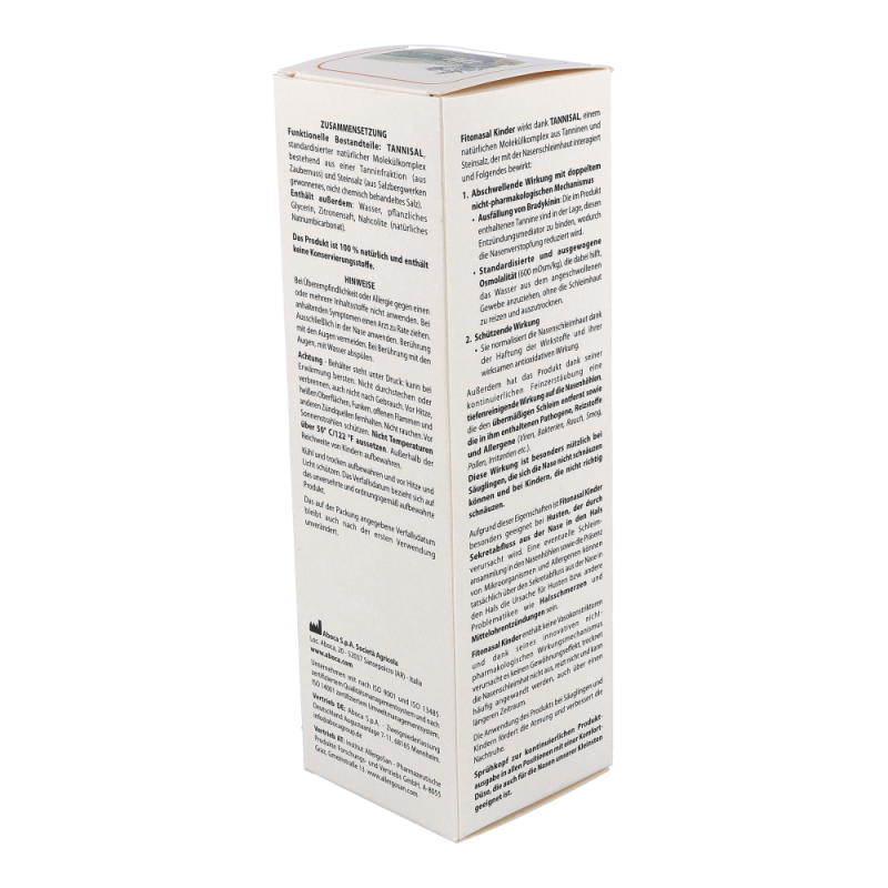 Fitonasal Kinder ist ein speziell entwickeltes abschwellendes Nasenspray, das dazu beiträgt, die Nasenverstopfung und Reizung der Nasenhöhlen bei den Kleinen zu lindern, verursacht durch Erkältungen, grippale Infekte, allergischen Schnupfen oder Sinusitis, sowohl in akuter als auch chronischer Form. Die Wirkung beruht auf TANNISAL, einem natürlichen Molekülkomplex aus Tanninen und Steinsalz, der mit der Nasenschleimhaut interagiert und Folgendes bewirkt: