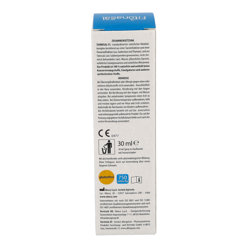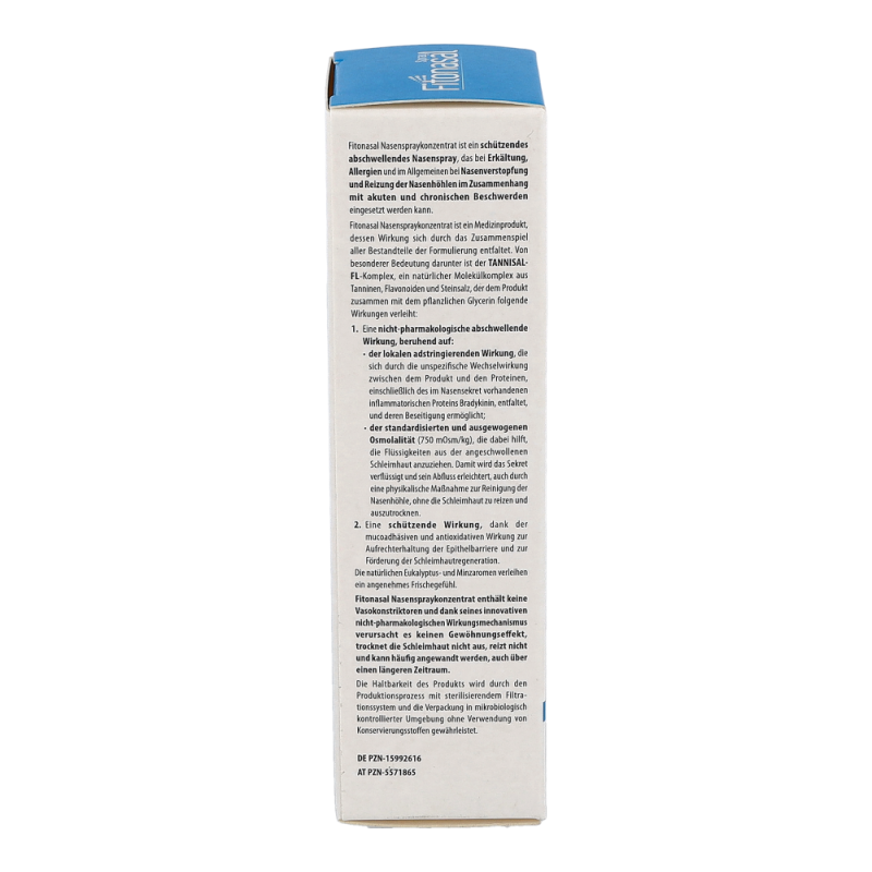 Fitonasal Nasenspraykonzentrat ist ein schützendes und abschwellendes Nasenspray, das bei Erkältungen, Allergien sowie bei verstopfter Nase und gereizten Nasenhöhlen eingesetzt werden kann, sowohl bei akuten als auch bei chronischen Beschwerden. Die Wirkung dieses Produkts beruht auf der Synergie aller enthaltenen Inhaltsstoffe. Besonders hervorzuheben ist der TANNISAL-FL-Komplex – ein natürlicher Molekülkomplex aus Tanninen, Flavonoiden und Steinsalz. In Kombination mit pflanzlichem Glycerin entfaltet dieser Komplex folgende Wirkungen: