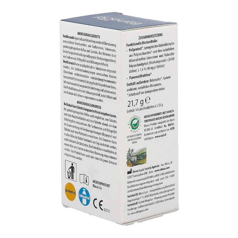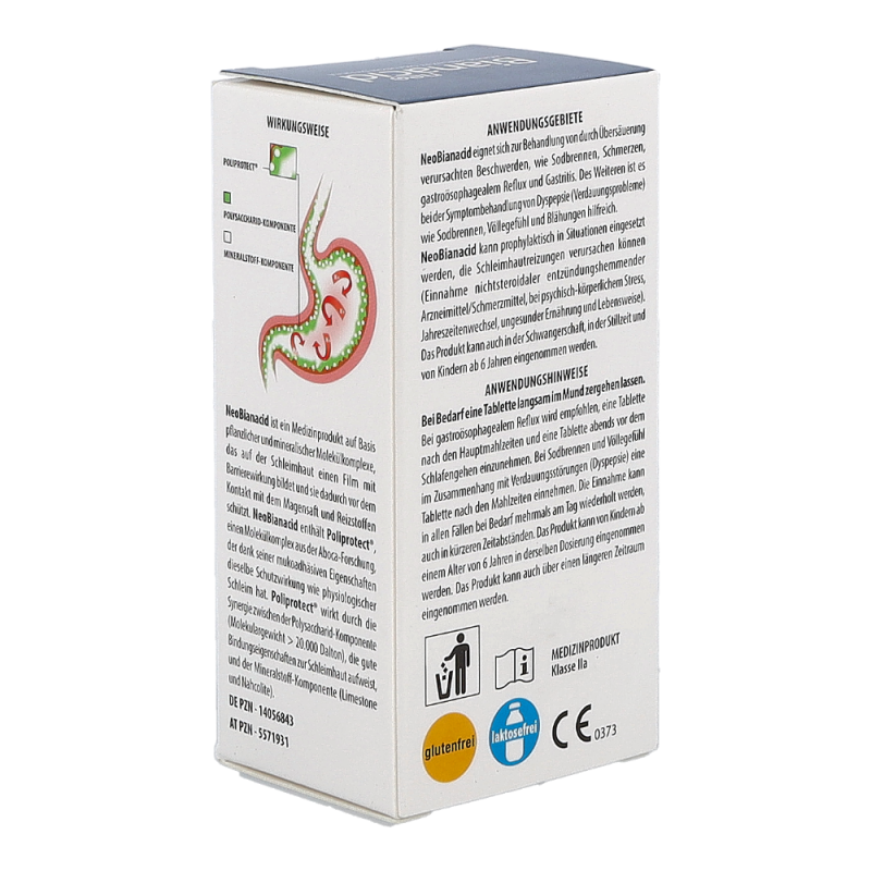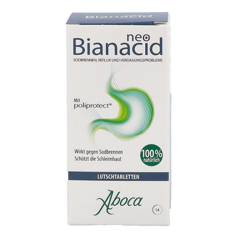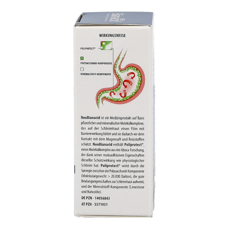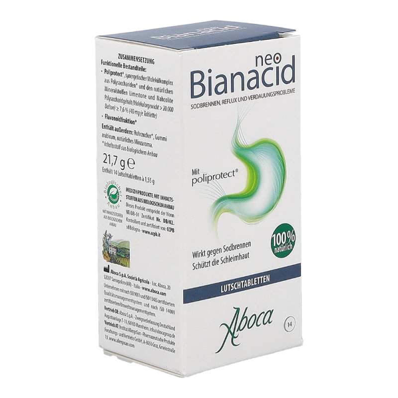 NeoBianacid ist ein Produkt, das auf pflanzlichen und mineralischen Molekülkomplexen basiert und eine schützende sowie schmerzlindernde Wirkung auf die Schleimhäute von Magen und Speiseröhre ausübt. Es hilft schnell gegen die typischen Symptome einer gereizten und entzündeten Schleimhaut wie Sodbrennen, Schmerzen und ein unangenehmes Säuregefühl.