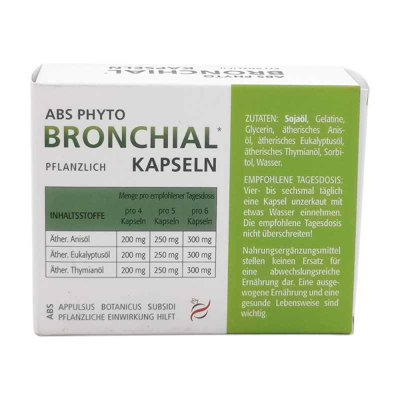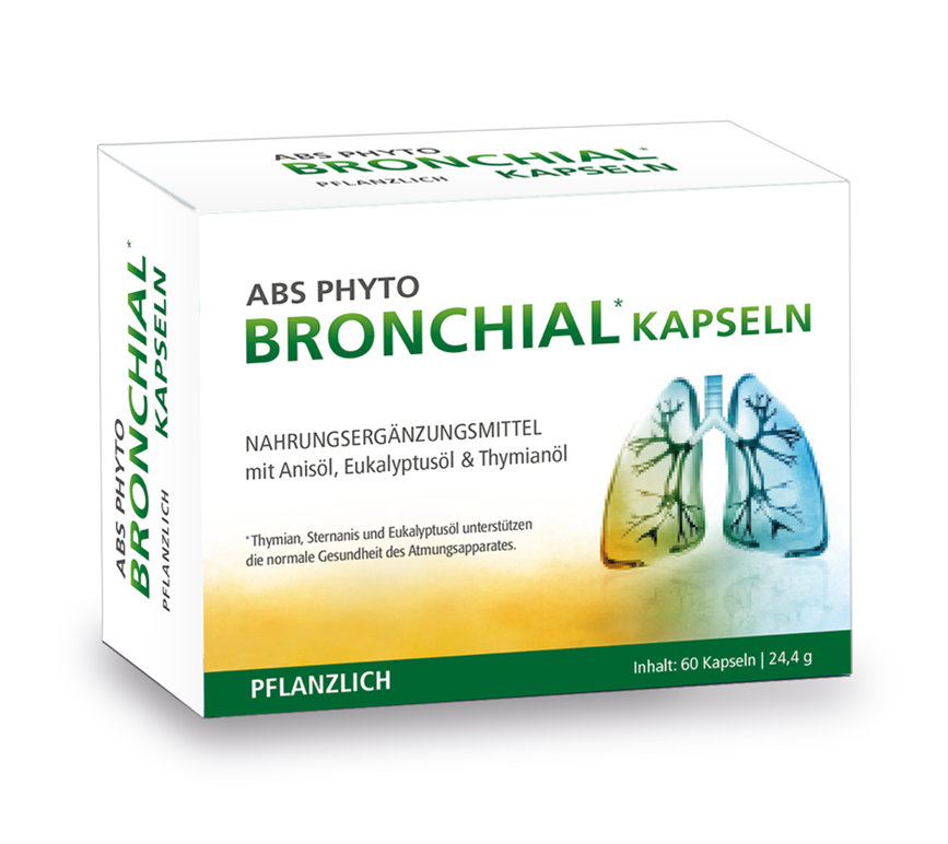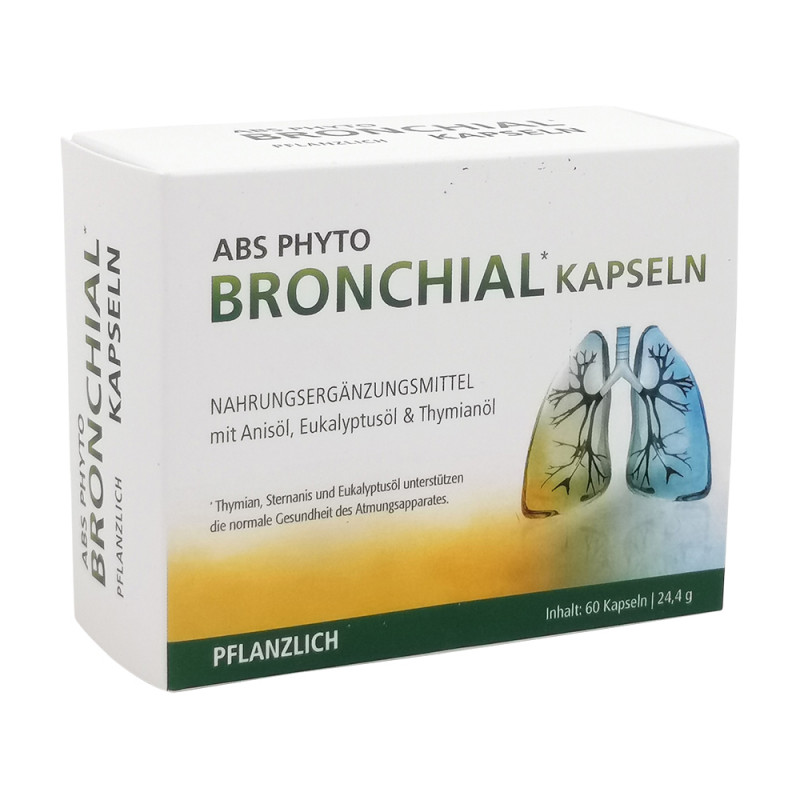 ABS Phyto Bronchial Kapseln helfen gegen chronische Bronchialkatharre. Außerdem bekämpfen diese Kapseln trockenen Husten und lösen Hustenkrämpfe sowie zähen Schleim.
