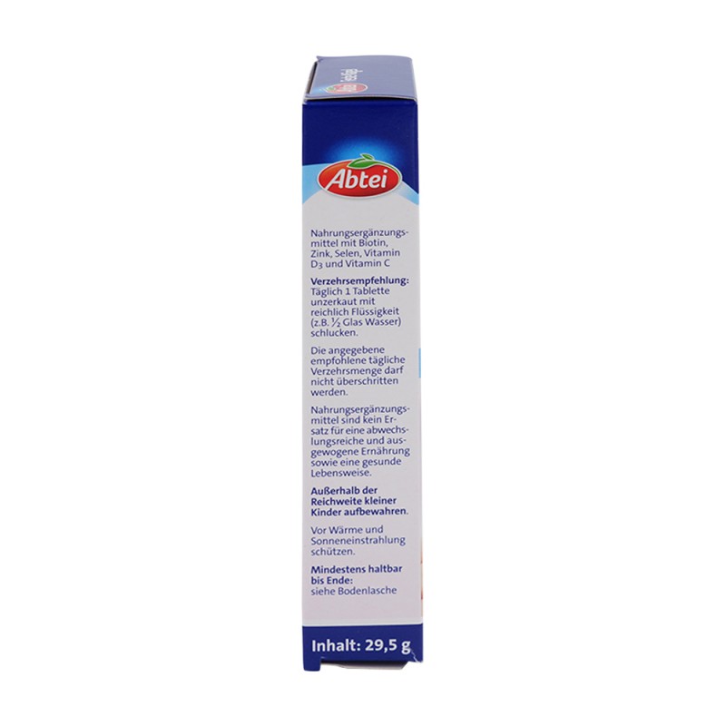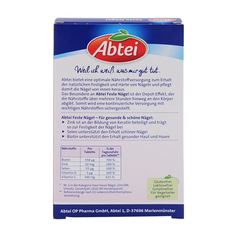 Abtei Feste Nägel bietet das erste Depot mit wichtigen Nährstoffen zum Erhalt der natürlichen Festigkeit und Härte von Nägeln. Zink ist an der Bildung von Keratin beteiligt und trägt so zu festen Nägeln bei. Das Antioxidans Selen ist für eine gesunde Schilddrüsenfunktion von Bedeutung, welche wichtig für den Erhalt schöner Nägel ist.
