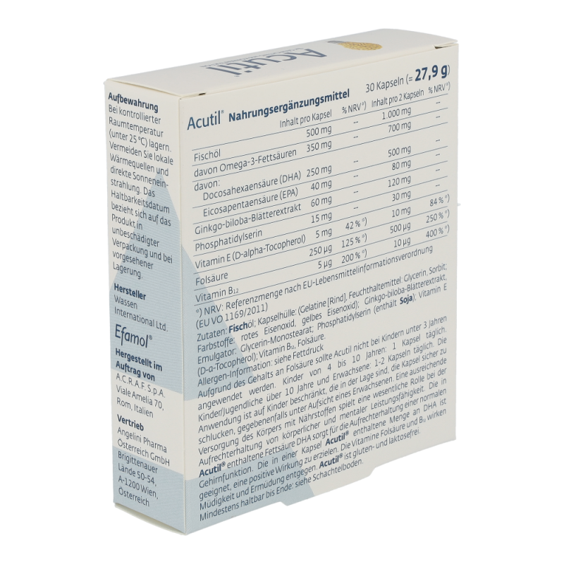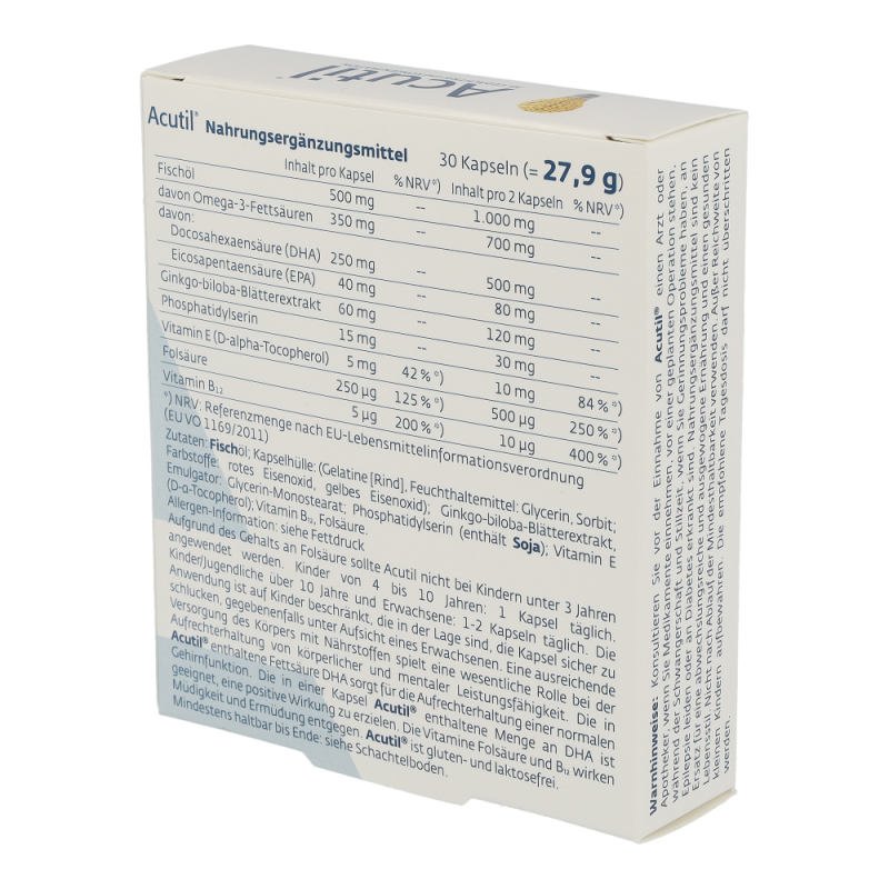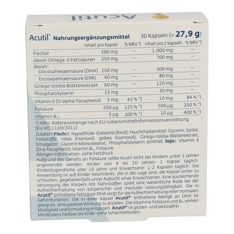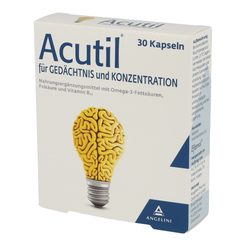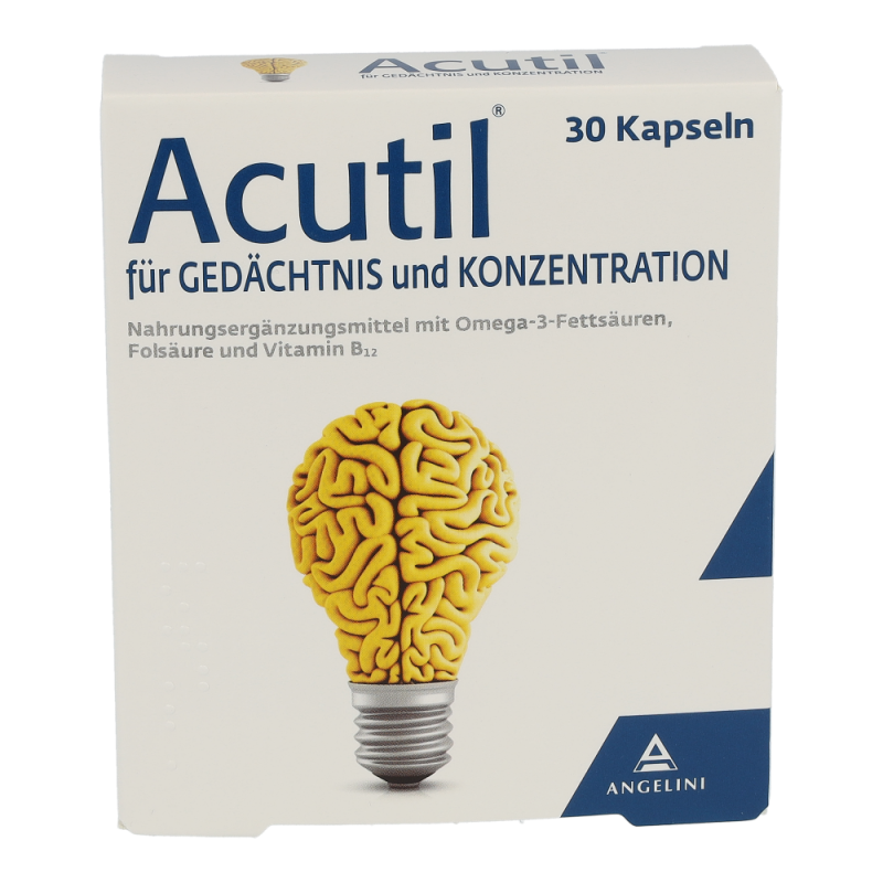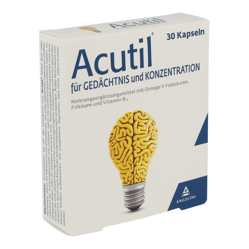 Acutil Kapseln versorgen den Körper mit Omega 3 Fettsäuren, Vitamin B12, Vitamin E, Folsäure und einem Extrakt aus den Blättern des Ginkgo Biloba. Sie wirken positiv auf Gehirnfunktionen wie die Konzentrations- und Gedächtnisfähigkeit.