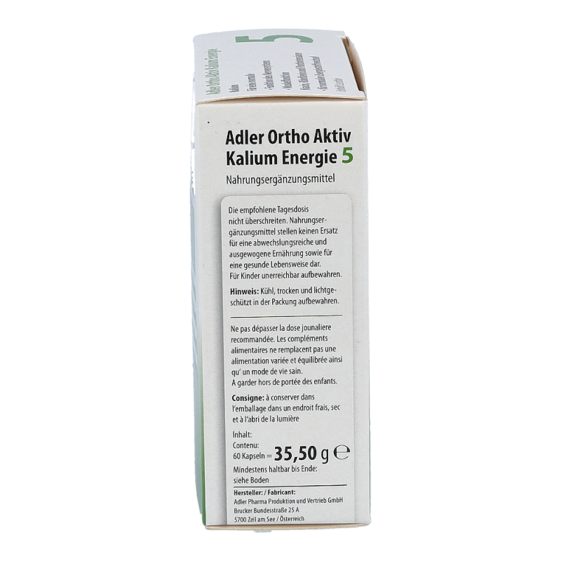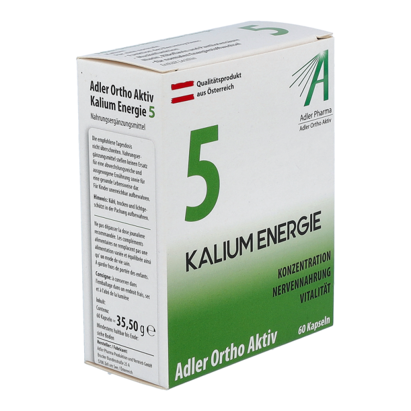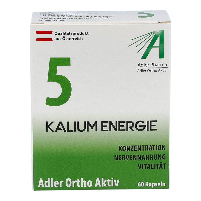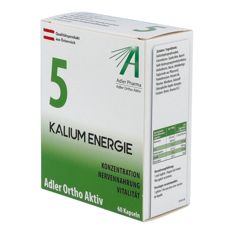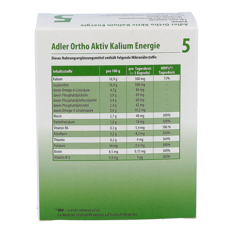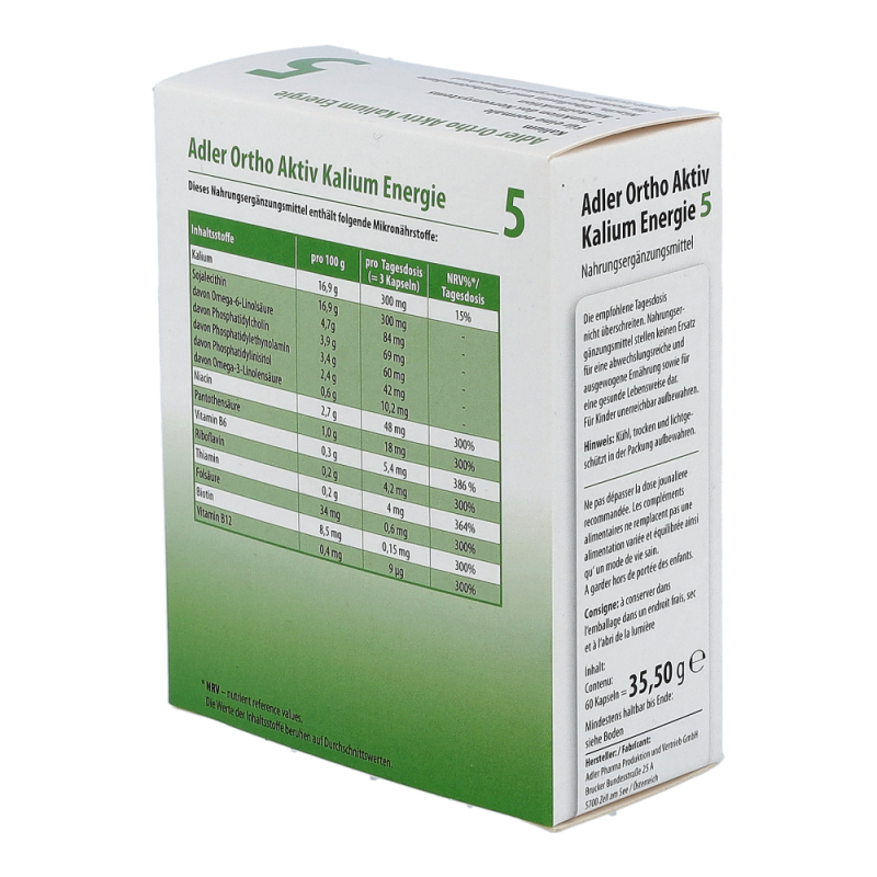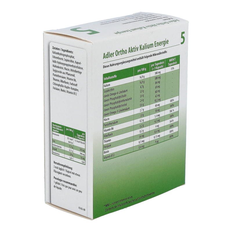 Adler Ortho Aktiv – die auf jedes Schüßler Salz von Nr. 1 – Nr. 12 abgestimmte Nährstoffkombinationen, welche die ganzkörperliche Wirkung des betreffenden Schüßler Salzes begleiten und unterstützen.Kalium trägt zu einer normalen Funktion des Nervensystems und einer normalen Muskelfunktion beiNiacin trägt zu einem normalen Energiestoffwechsel und zur Verringerung von Müdigkeit und Ermüdung beiThiamin trägt zu einem normalen Energiestoffwechsel, einer normalen Funktion des Nervensystems und zur normalen psychischen Funktion beiRiboflavin trägt zur Verringerung von Müdigkeit und Ermüdung beiPantothensäure trägt zu einem normalen Energiestoffwechsel, zur Verringerung von Müdigkeit und Ermüdung und zu einer normalen geistigen Leistung beiBiotin trägt zur normalen psychischen Funktion, normalen Funktion des Nervensystems und zu einem normalen Energiestoffwechsel beiFolat trägt zu einer normalen psychischen Funktion und zur Verringerung von Müdigkeit und Ermüdung beiVitamin B12 trägt zu einer normalen Funktion des Nervensystems und zu einem normalen Energiestoffwechsel beiEnthält Lecithin.