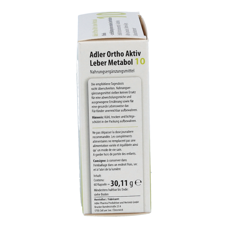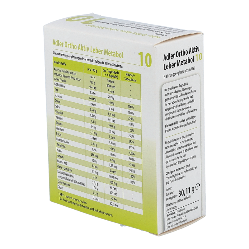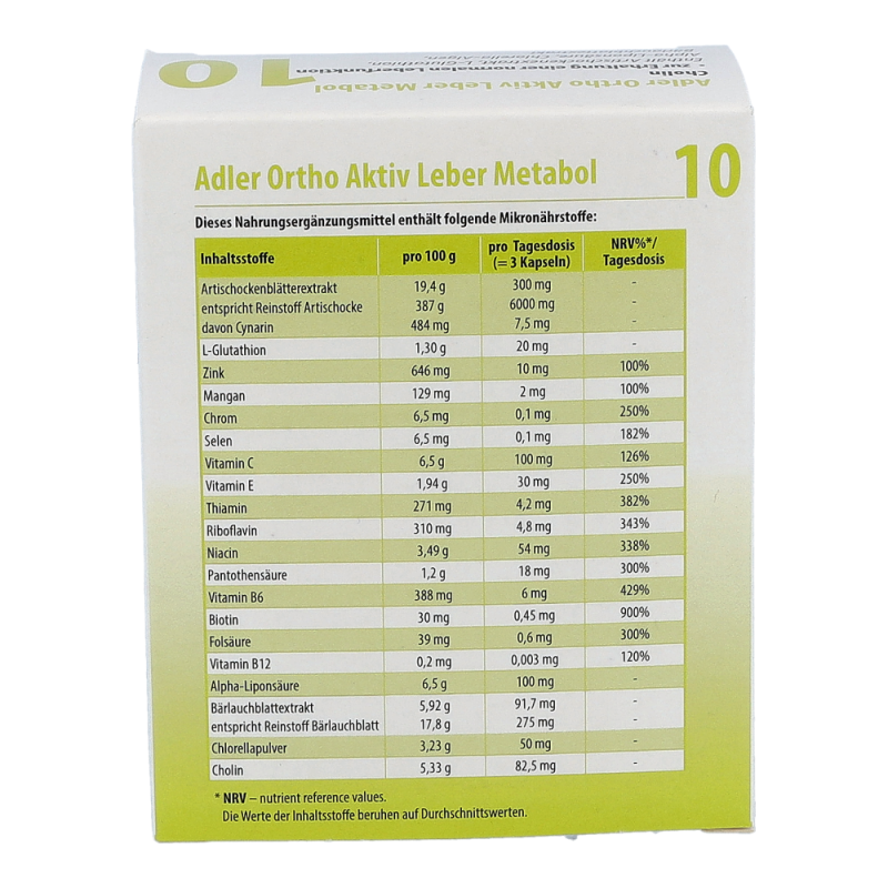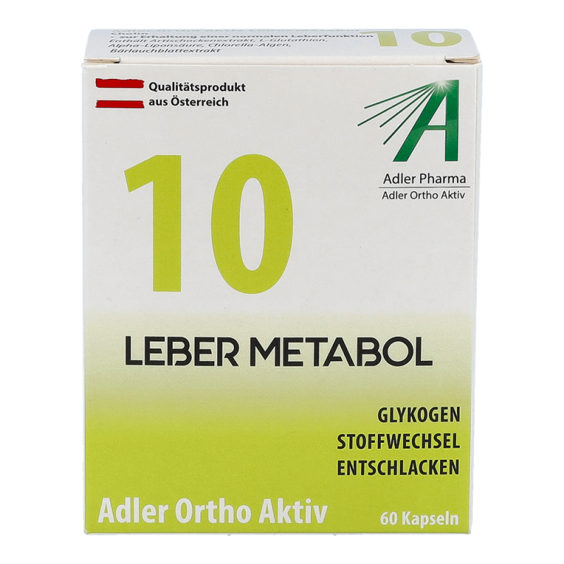 Die Adler Ortho Aktiv 10 Leber Metabol Kapseln begleiten und unterstützten die ganzkörperliche Wirkung des Schüßler Salzes Nr. 10. Sie wirken sich positiv auf den Fett- und Energiestoffwechsel aus und unterstützen die Leber in ihrer Schadstoffausscheidung. Die Kapseln können auch ohne Einnahme von Schüßler Salzen entsprechend der angegebenen Aussage auf der Packung angewendet werden.