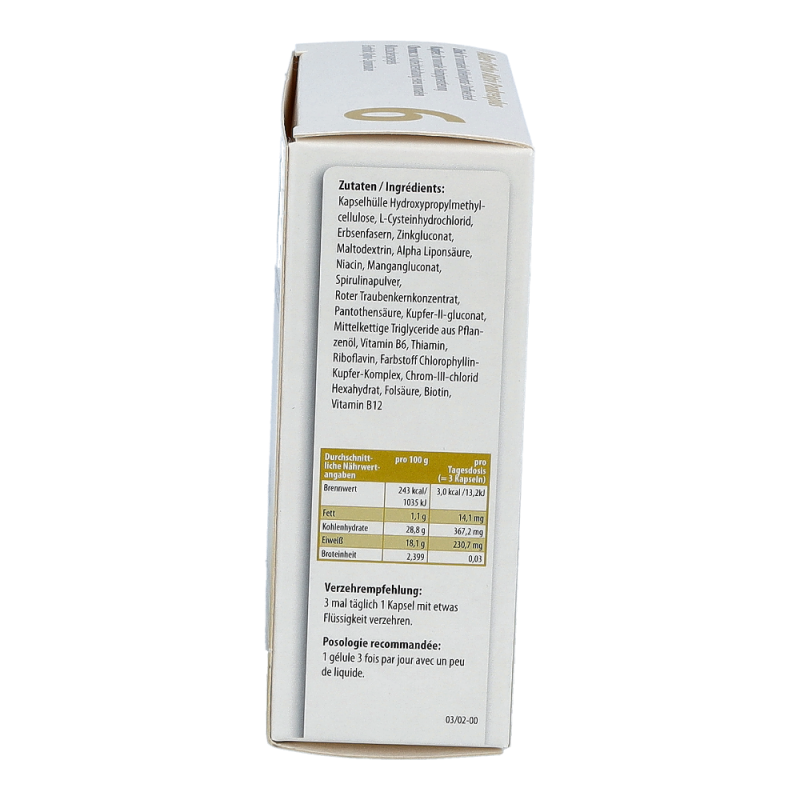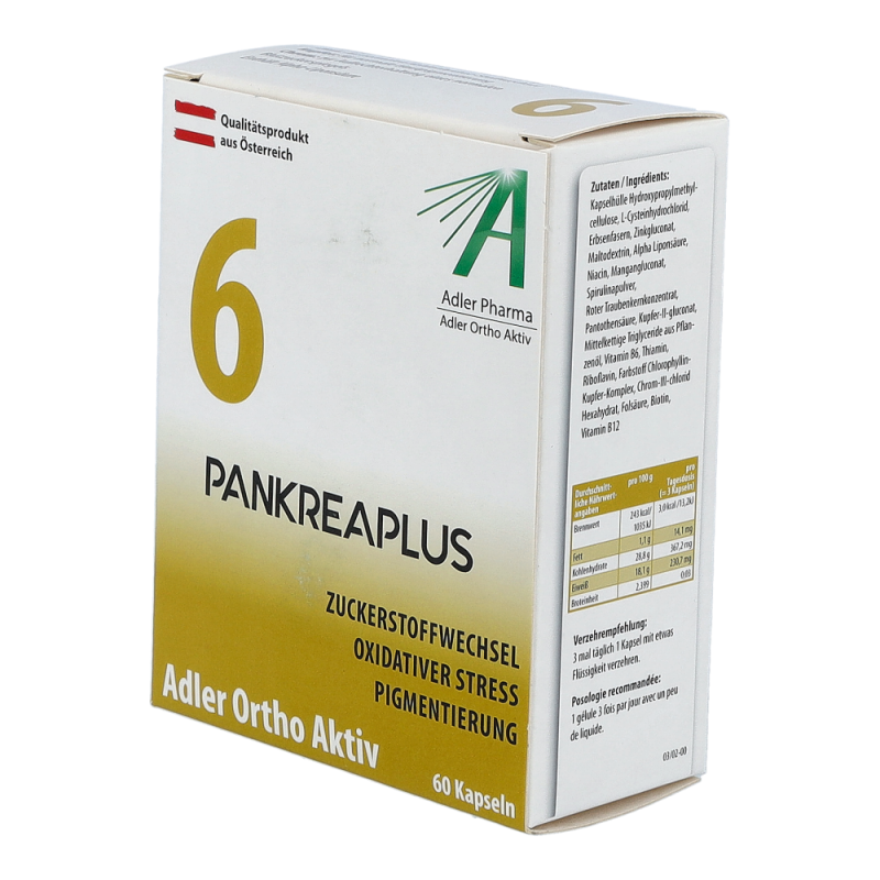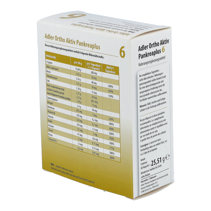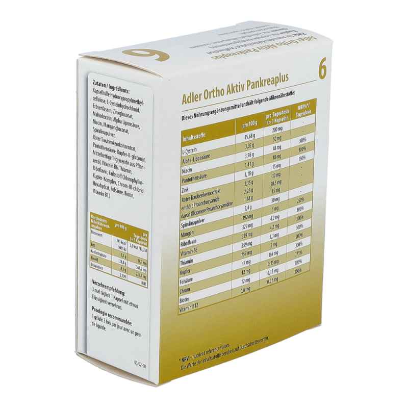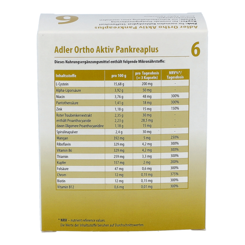 Adler Ortho Aktiv – die auf jedes Schüßler Salz von Nr. 1 – Nr. 12 abgestimmte Nährstoffkombinationen, welche die ganzkörperliche Wirkung des betreffenden Schüßler Salzes begleiten und unterstützen.Chrom trägt zur Aufrechterhaltung eines normalen Blutzuckerspiegels beiNiacin, Thiamin, Riboflavin, Pantothensäure, Biotin, Folat, Vitamin B12 trägt zu einem normalen Energiestoffwechsel beiZink trägt zu einem normalen Kohlenhydrat-Stoffwechsel, zu einer normalen Funktion des Immunsystems bei und hilft, die Zellen vor oxidativen Stress zu schützenMangan trägt zu einem normalen Energiestoffwechsel bei und trägt dazu bei, die Zellen vor oxidativen Stress zu schützenKupfer trägt zu einer normalen Hautpigmentierung bei und trägt dazu bei, die Zellen vor oxidativen Stress zu schützenEnthält Alpha-Liponsäure.