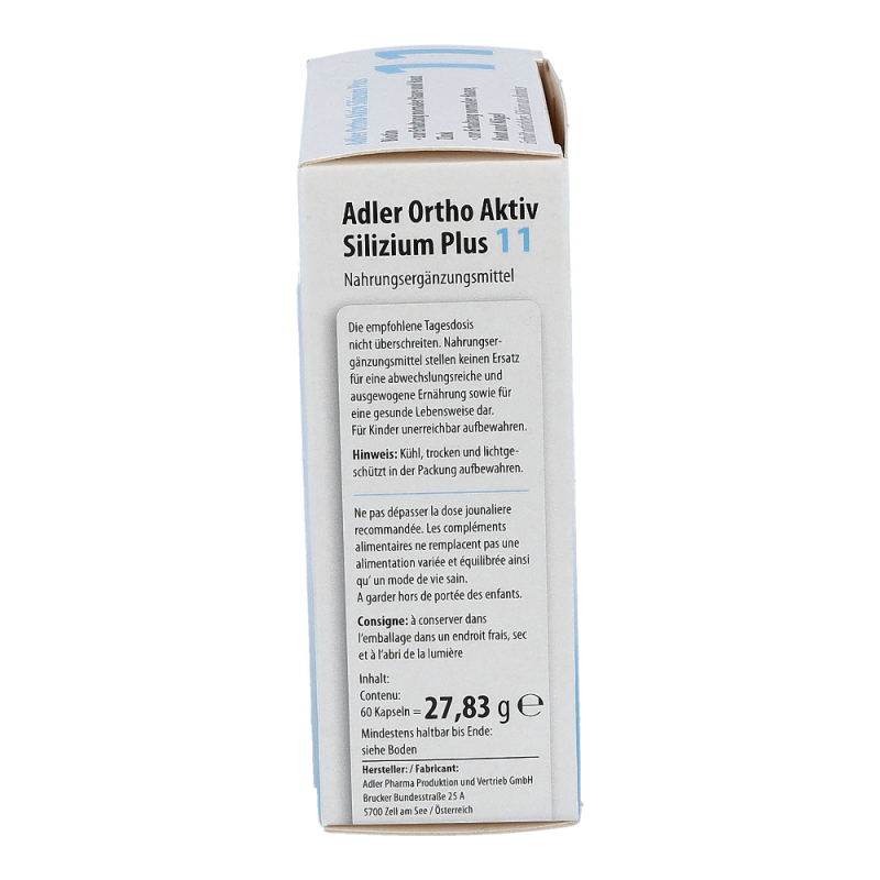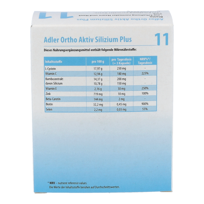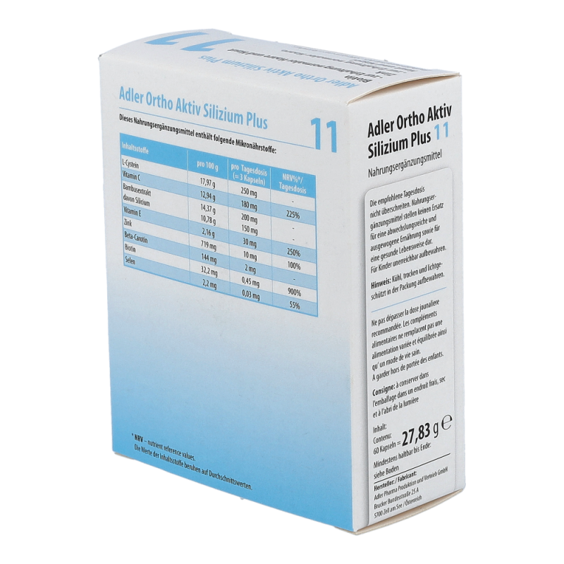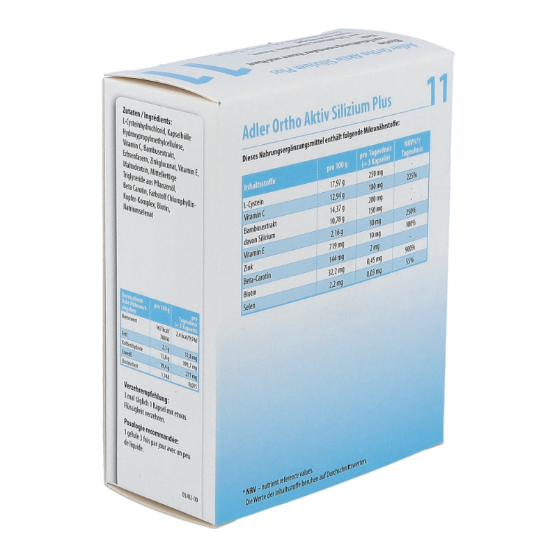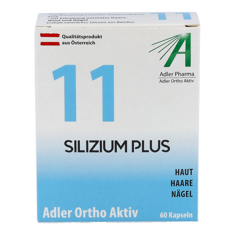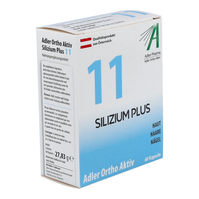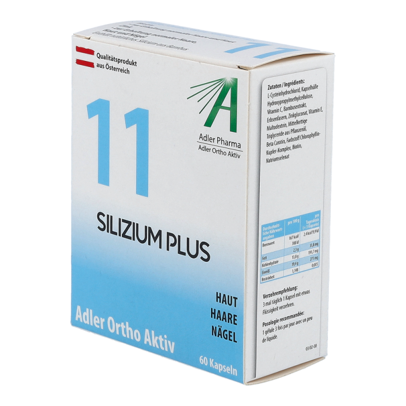 Adler Pharma Ortho Aktiv Kapseln Nr. 11 enthalten Vitamin C, welches zu einer normalen Kollagenbildung für eine normale Funktion der Haut beiträgt. Weitere Wirkstoffe in diesen Kapseln sind Selen, Biotin und Zink.Silicium aus Kieselerde und Vitamin C fördert den Aufbau eines gesunden und elastischen Bindegewebes. Kieselerde besteht zu etwa 90 % aus Siliziumdioxid, welches aus Kieselalgen hergestellt wird. Das darin enthaltene Silicium ist wichtig für die Neubildung von Haut, Haaren, Nägeln und Knorpeln. Vor allem im Bindegewebe ist Silicium verantwortlich für die Bildung und Quervernetzung der kollagenen Eiweißfasern sowie der strukturelastischen Grundsubstanz was zu einer strafferen und pralleren Haut führen kann. Adler Ortho Aktiv Kapseln Nr. 11 stellen deshalb eine perfekte Kombination von Wirkstoffen dar, um alle Anwendungsgebiete optimal abzudecken..