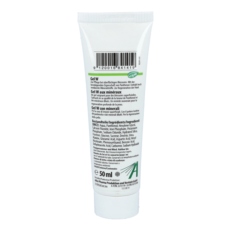 Adler Pharma Dr. Schüßler Gelmischung W dient zur Pflege von oberflächlichen Blessuren. Die Mineralstoffe und das Panthenol unterstützen eine rasche Hautregeneration. Das Gel hat zudem eine beruhigende Eigenschaft auf die Oberhaut.
