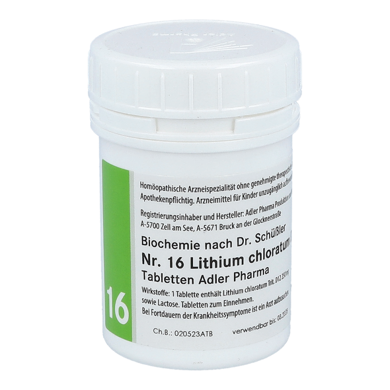 Die Nr. 16 fördert die Ausscheidung von Harnsäure über die Harnwege und fördert die Reinigung des Bindegwebes. Traditionell wird sie bei Schwellungen im Bereich der Endgelenke der Extremitäten eingesetzt. Die Wirkung des Lithiums liegt vor allem im Einfluss auf die Lösung der Harnsäure. Sie wird weiters bei Entzündungen der ableitenden Harnwege eingesetzt. Außerdem kommt sie bei Nierenentzündungen, Nierenstauungen, Blasenentzündungen, Blasenkatarrhen, Harnröhrenkatarrhen, dies als Begleitung zur ärztlichen Therapie zur Anwendung.