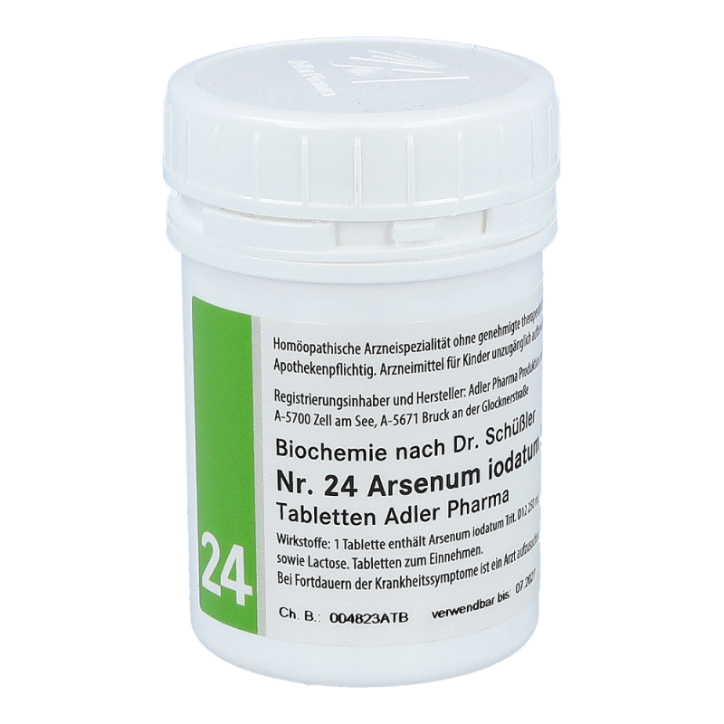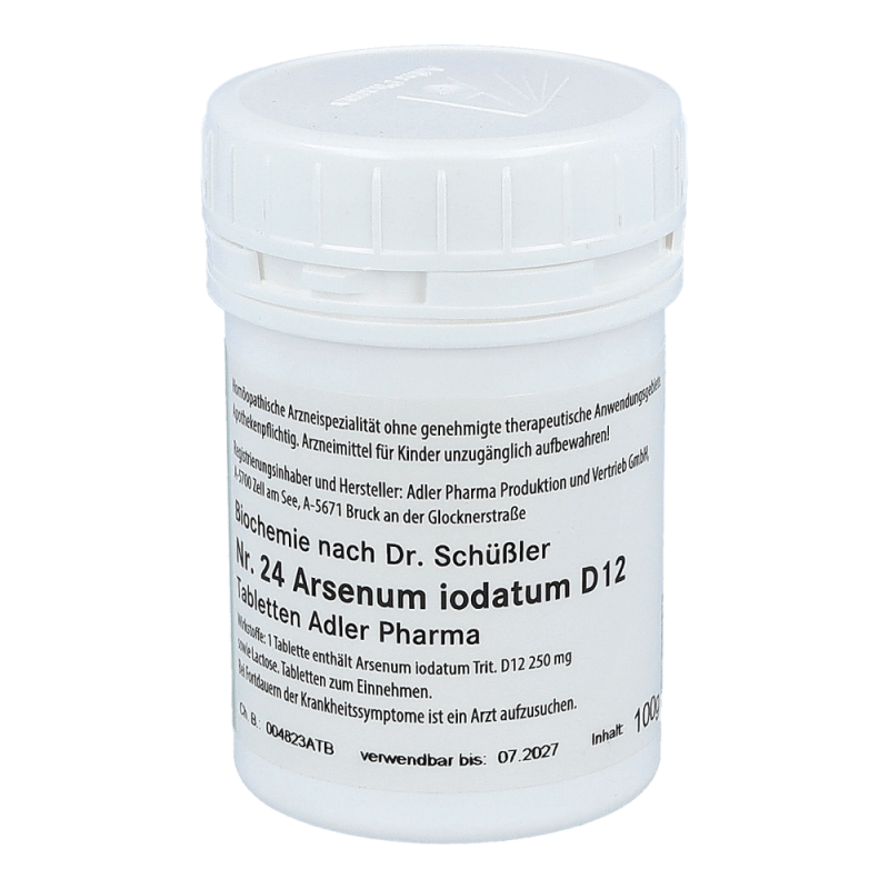 Adler Pharma Schüßler Nr. 24 Arsen Jodatum wirkt zwar auf den ganzen Organismus, jedoch vor allem aber auf die Haut und Schleimhäute. Außerdem wird der Körper bei der Herstellung des Schilddrüsenhormons Thyroxin von Jod-Ionen unterstützt. Denn wenn der Körper zu wenig Thyroxin bildet, kann ein Kropf entstehen oder eine allgemeine Schwäche auftreten.