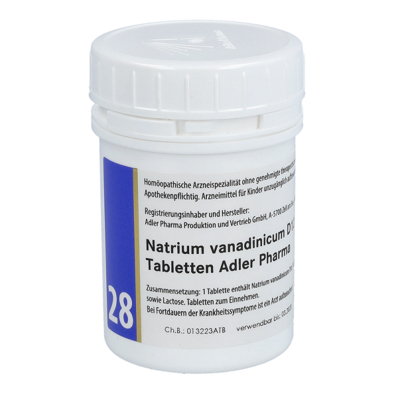 Schüßler Nr. 28 Natrium Vanadium hat Bedeutung für den Kohlenhydratstoffwechsel, den Cholesterin- und Fettstoffwechsel und stärkt darüber hinaus den Knochenaufbau. Daüber hinaus kann es den Herzmuskel stärken und soll sogar die Arbeit der Bauchspeicheldrüse unterstützen.