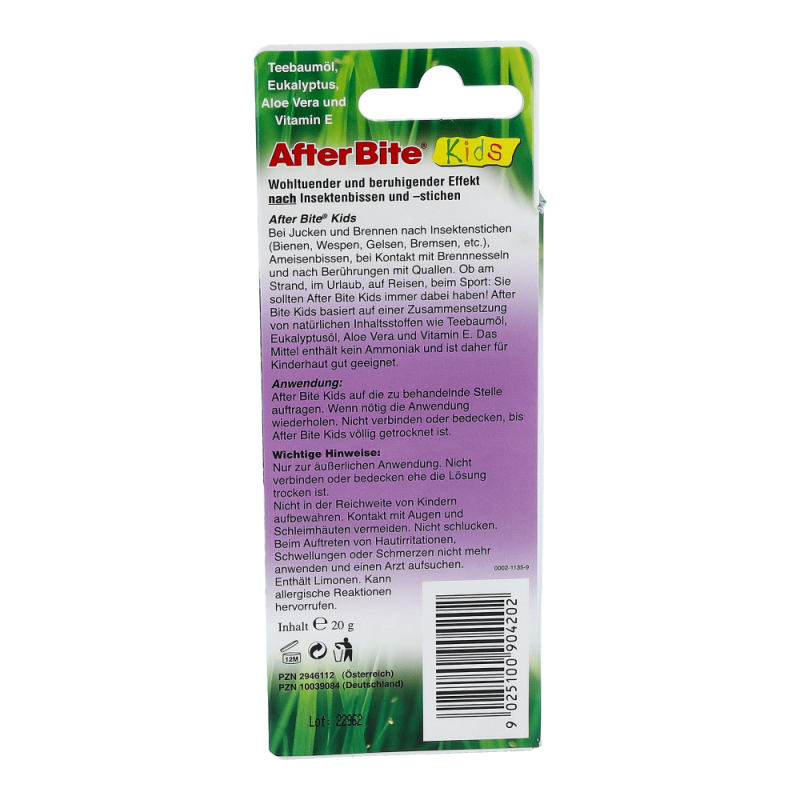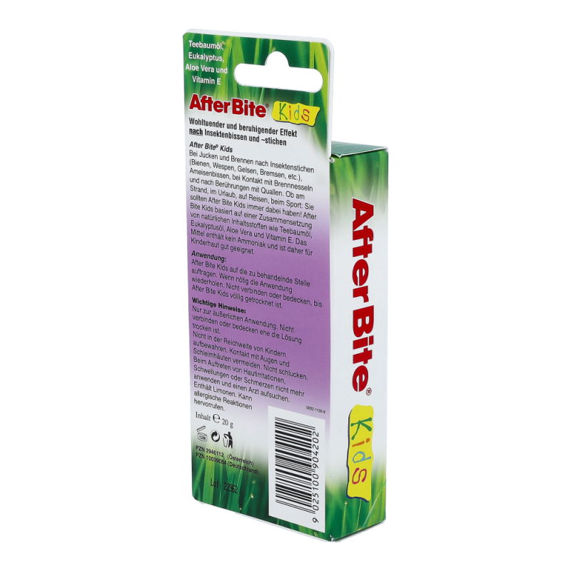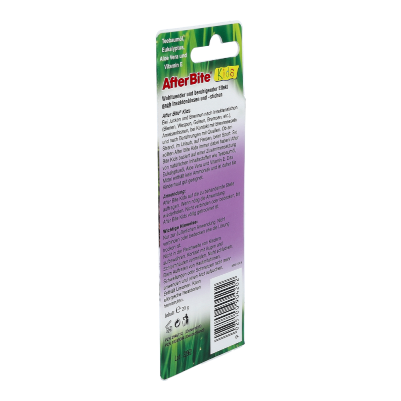 After Bite Stift nach Biss wirkt dem Juckreiz nach Insektenstichen und –bissen besonders schnell entgegen. Der After Bite Stift ist zudem auch bestens bei Brennnesselverbrennungen und Quallenstichen geeignet. Der praktische Stift ist leicht in der Anwendung und passt durch die handliche Größe in jede Tasche.