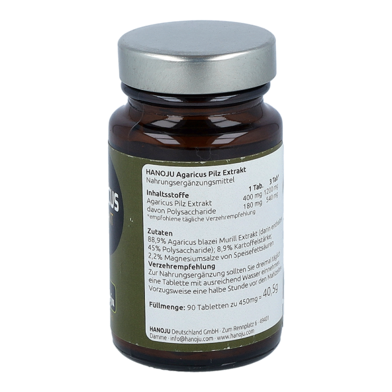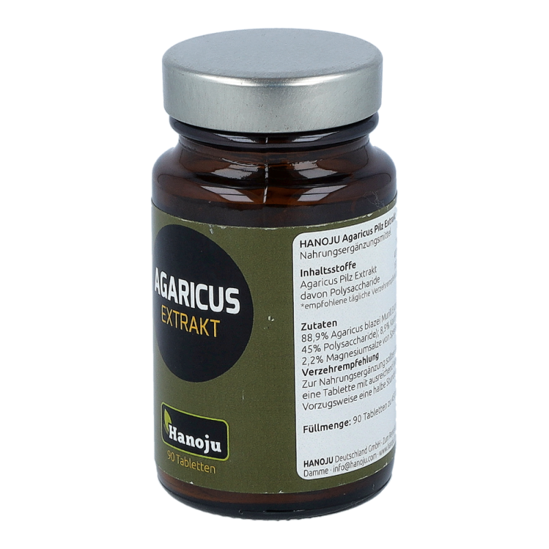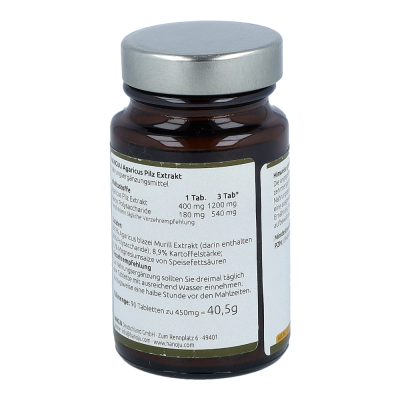 Drei Tabletten enthalten- (empfohlene tägliche Verzehrmeng) 1200 mg Agaricus blazei Murill Extrakt (darin enthalten *45% Polysaccharide), 120 mg Kartoffelstärke, 30 mg Magnesiumstearat.