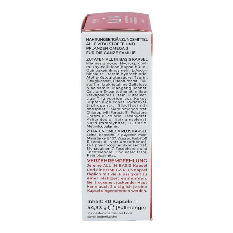 Je eine OMEGA PLUS Kapsel und eine ALL IN Kapsel täglich mit viel Flüssigkeit zu einer Mahlzeit einnehmen. Bei trockener, juckender Haut kann auch 2 x täglich je eine Kapsel eingenommen werden.