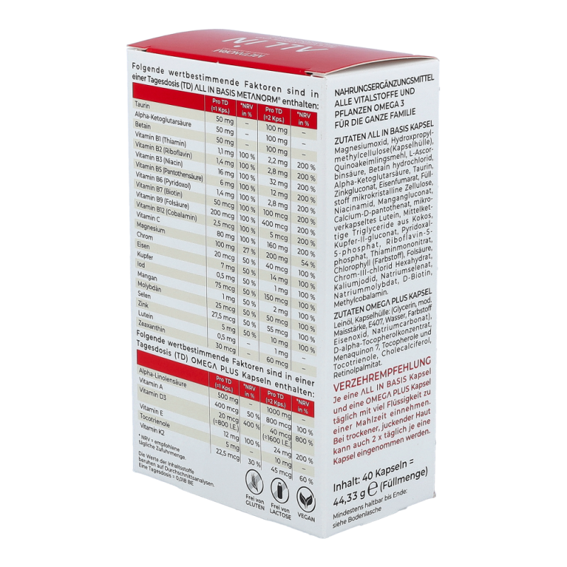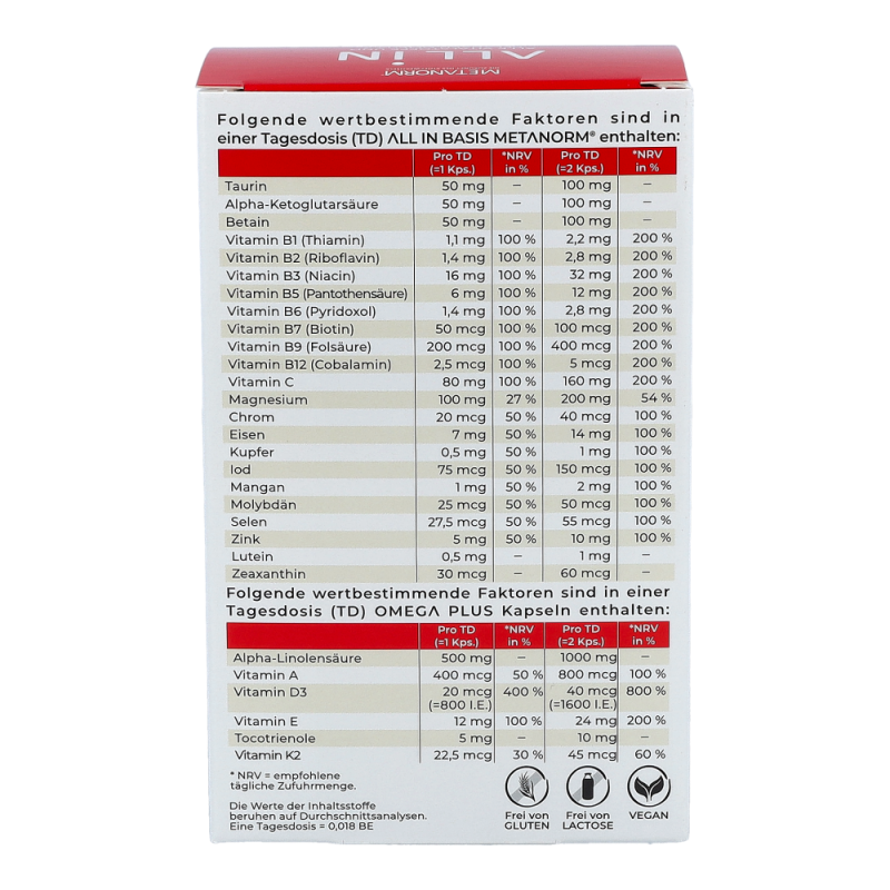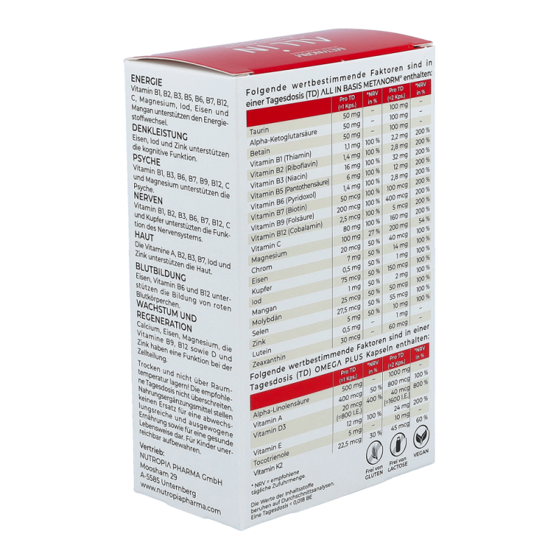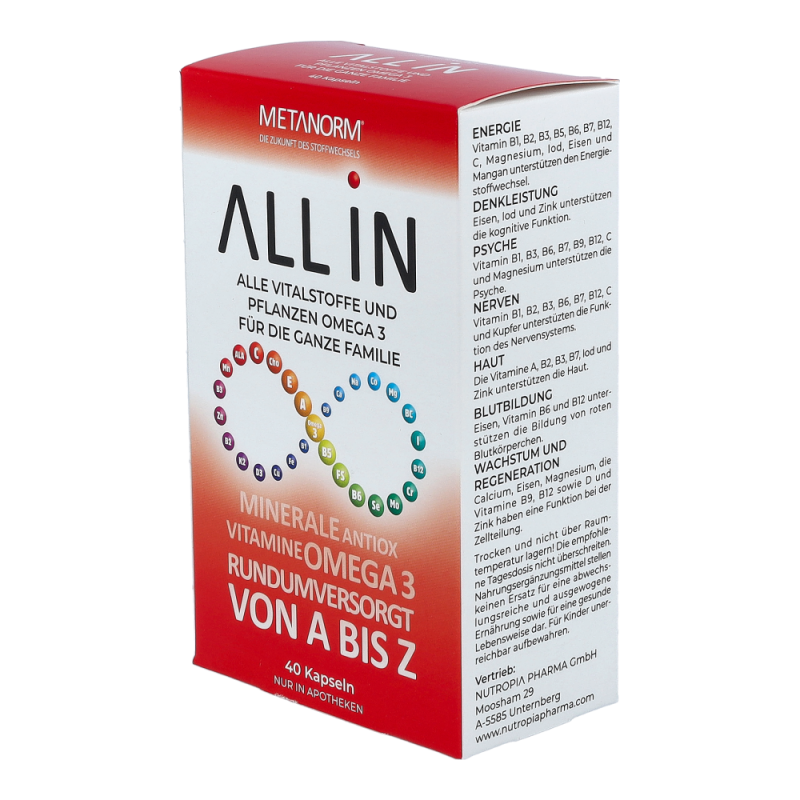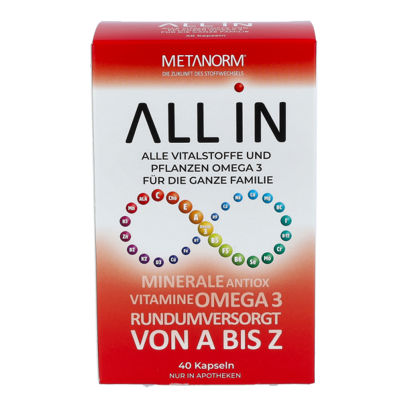 ALL IN Kapseln METANORM® enthalten alle Mikronährstoffe, welche für einen reibungslosen Ablauf des Stoffwechsels notwendig sind.
