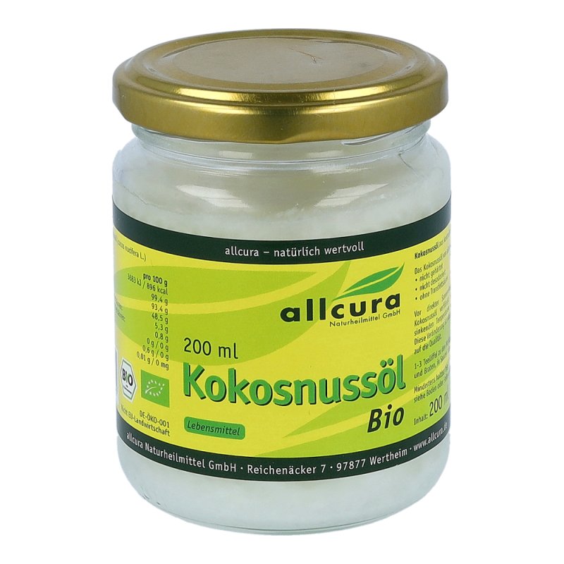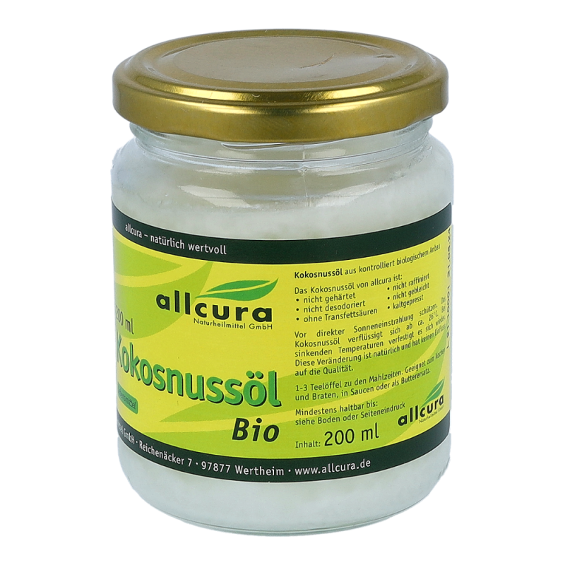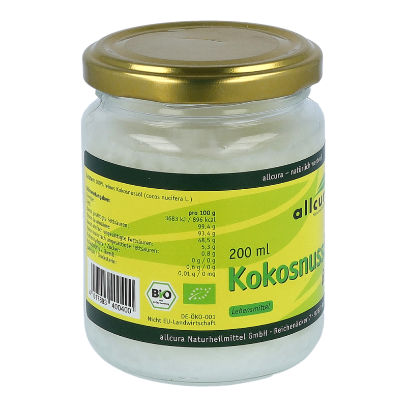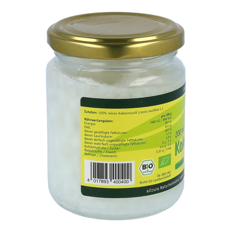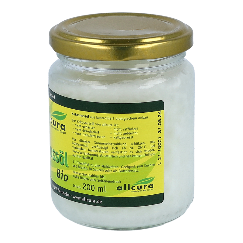 Allcura Bio Kokosnuss Öl ist nicht raffiniert, gebleicht, desodoriert oder gehärtet und daher von höchster Qualität. Das Produkt enthält ausschließlich biologische Inhaltsstoffe.