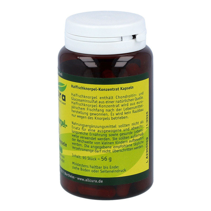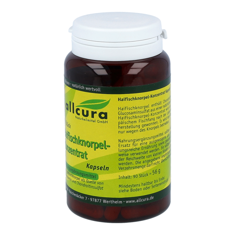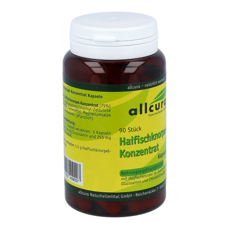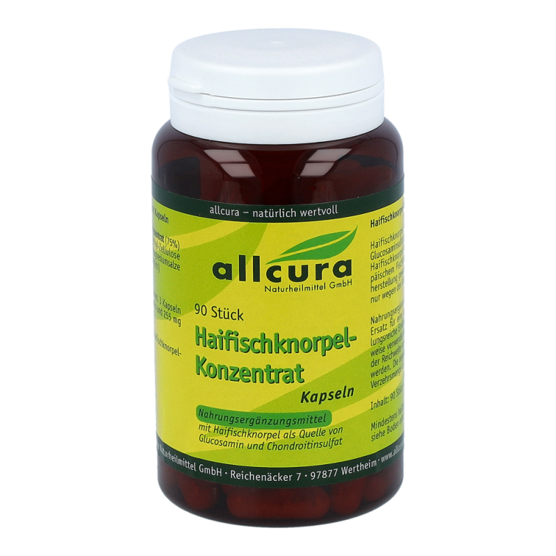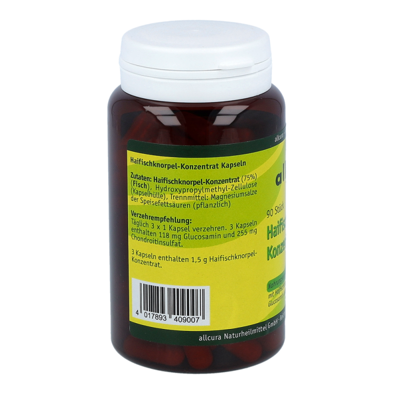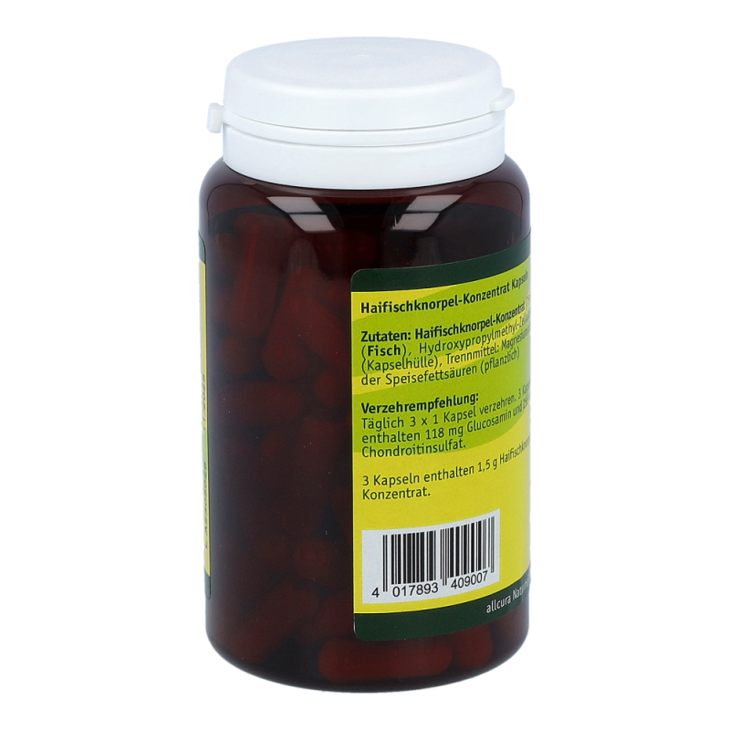 "Zutaten: Haifischknorpel-Konzentrat (75 %), Hydroxypropylmethyl-Zellulose (Kapselhülle), Maltodextrin, Trennmittel: Magnesiumsalze von Speisefettsäuren (pflanzlich). 1 Kapsel enthält 500 mg Haifischknorpel-Konzentrat."