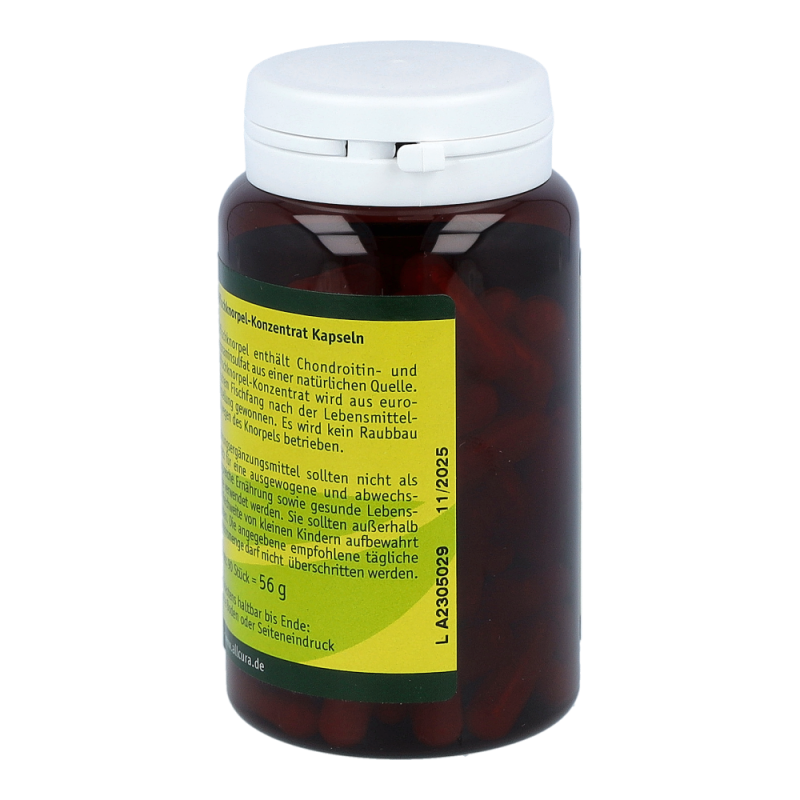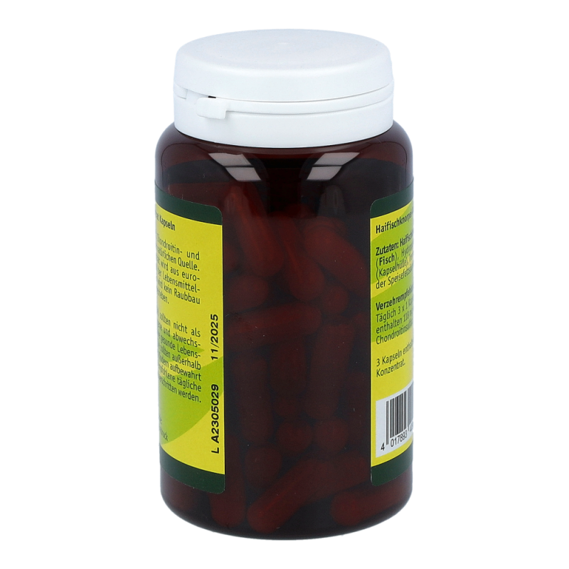 "Verzehrsempfehlung: 3 x 1 Kapsel täglich. 3 Kapseln enthalten 1,5 g Haifischknorpel-Konzentrat mit je 225 mg Chondroitinsulfat und 135 mg Glucosaminsulfat."