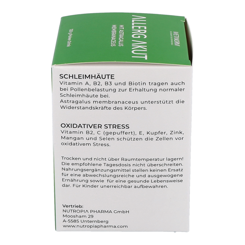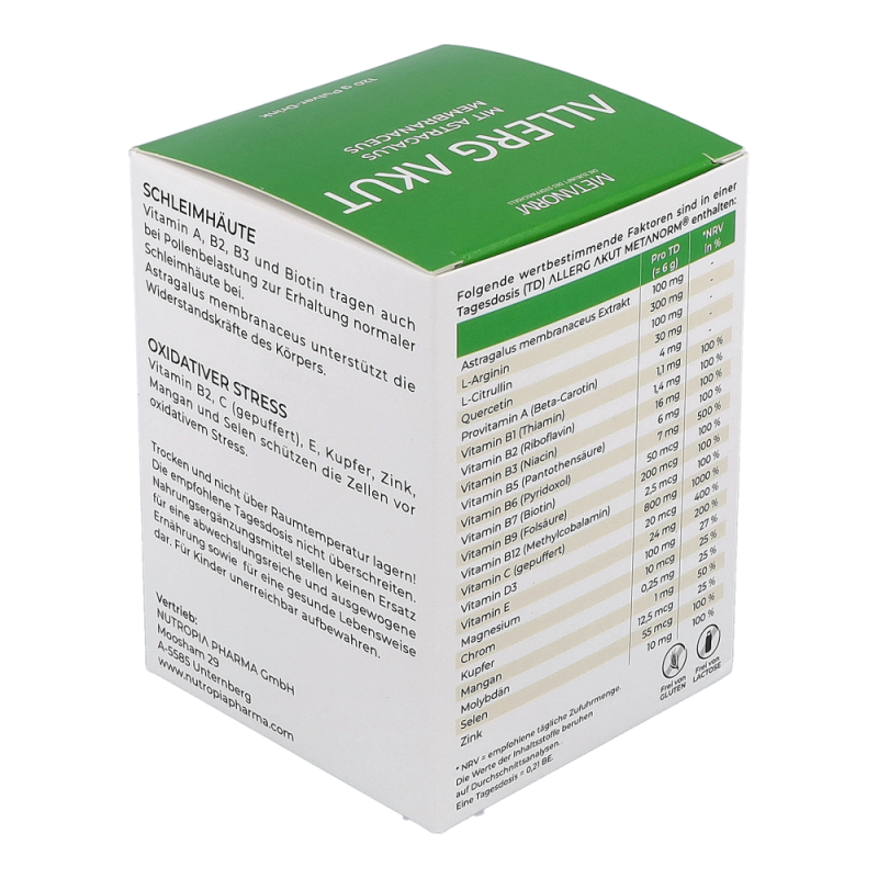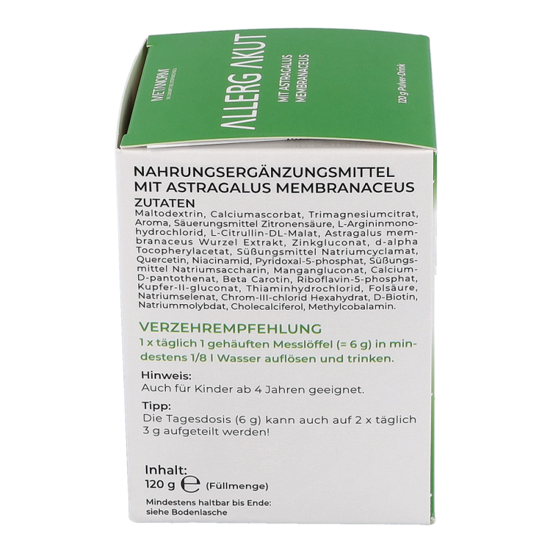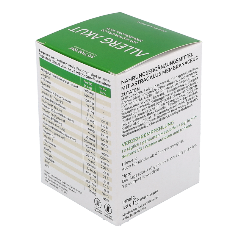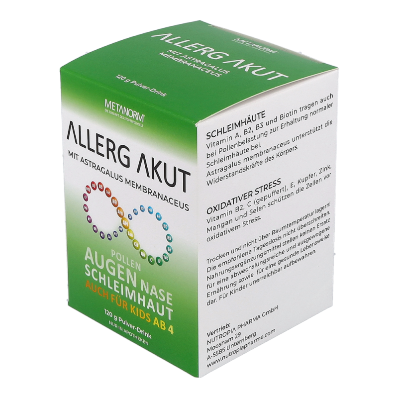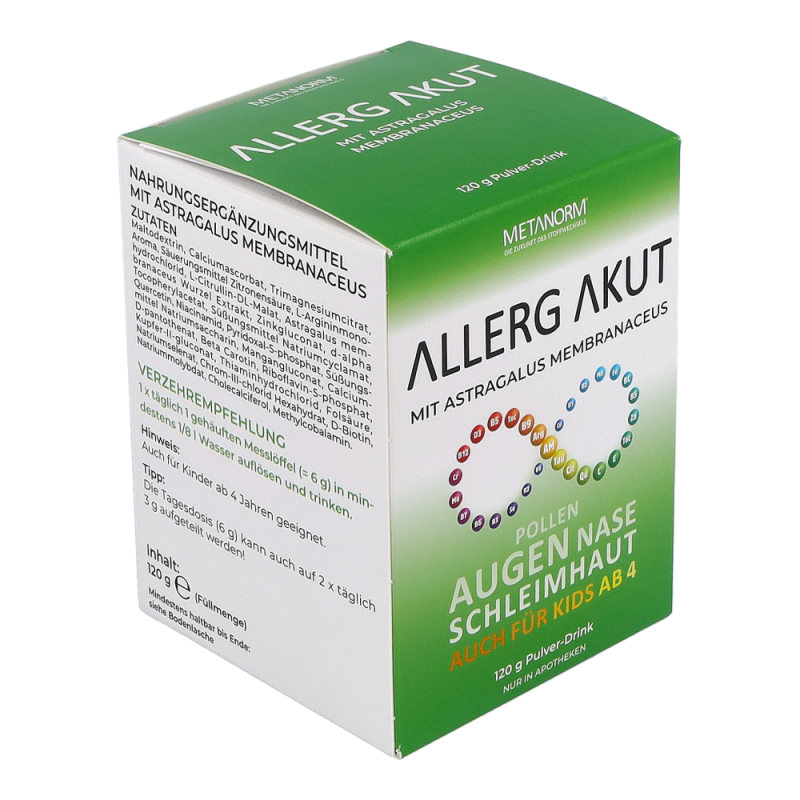 ALLERG AKUT Pulver-Drink METANORM® normalisiert die Abwehr Prozesse des Körpers und gleicht dadurch überschießende Reaktionen wie laufende Nase, gerötete, tränende Augen und Niesreiz aus.