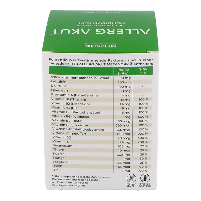 Folgende wertbestimmende Faktoren sind in einer Tagesdosis (TD) ALLERG AKUT METANORM® enthalten: