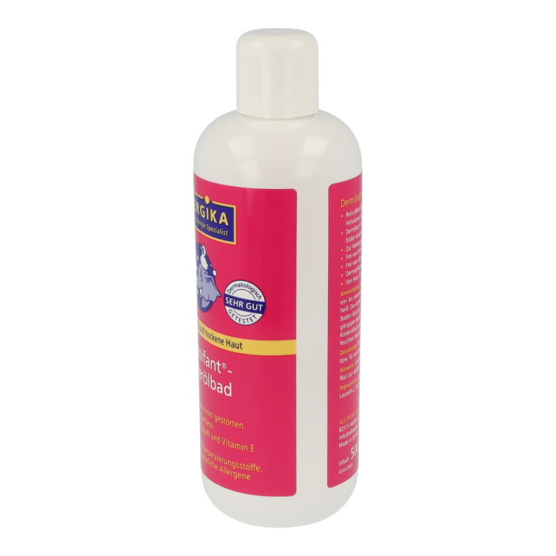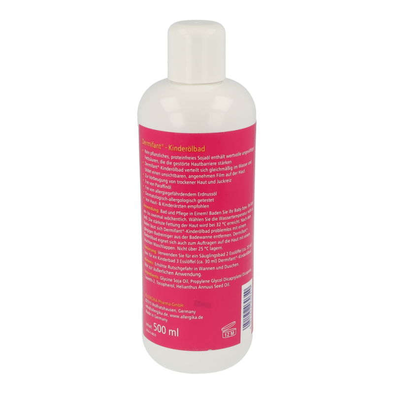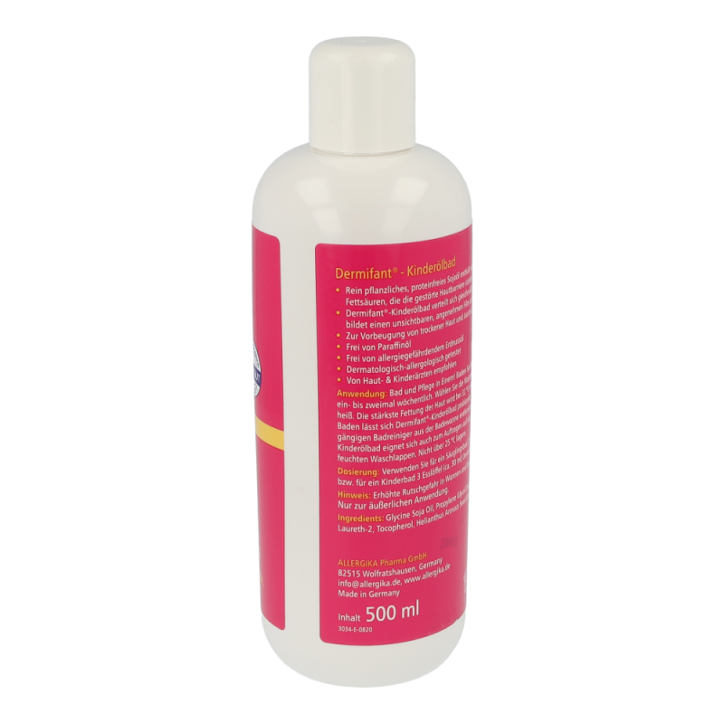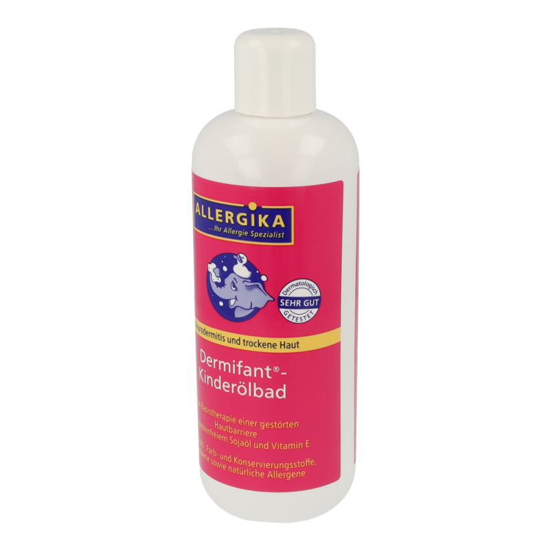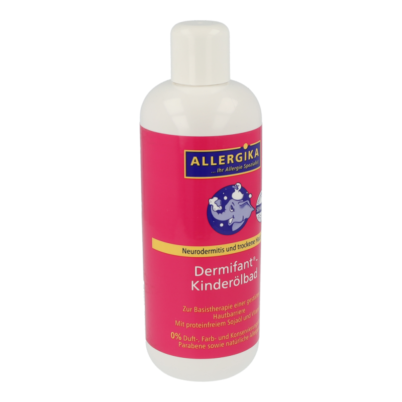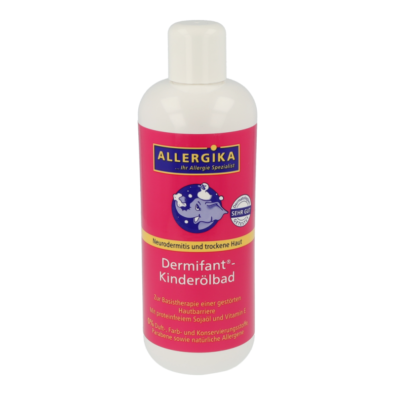 Allergika Dermifant Kinderölbad dient nicht der Reinigung, sondern der intensiven Pflege des ganzen Körpers. Wasser oder gar waschaktive Substanzen trocknen die Haut zu sehr aus. Dieses Ölbad enthält hochkonzentriertes, allergenarmes Soja-Öl mit mehr als 60% essentiellen Fettsäuren. Das Öl verteilt sich im Badewasser gleichmäßig. Auf der Haut hinterlässt es einen angenehmen Schutzfilm.