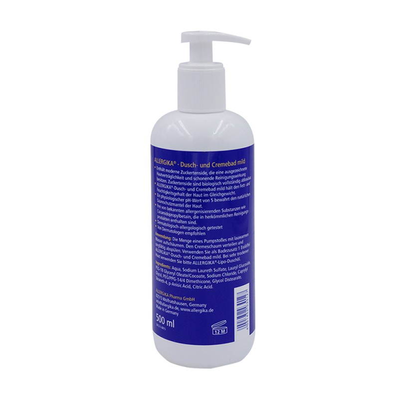 Allergika Dusche & Cremebad Mild ist eine hypoallergene, rückfettende, seifenfreie Hautreinigung für normale bis leicht trockene Haut. Diese Pflege ist bestens zur Anwendung im Gesicht, an den Händen und am Körper geeignet.