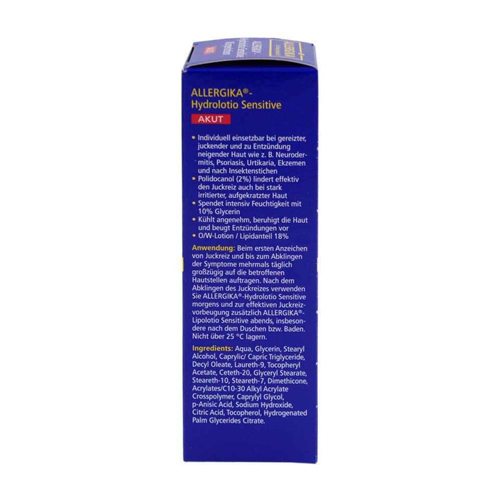 Allergika Hydrolotion Sensitiv ist eine schnell einziehende, leicht kühlende Körperlotion. Eine Wirkstoffkombinationaus Glycerin und Polidocanol lindert schnell akuten Juckreiz und spendet intensiv Feuchtigkeit. Sorgfältig ausgewählte Inhaltsstoffe garantieren eine hervorragende Hautverträglichkeit auch bei sehr empfindlicher Haut. Ideal zur Basispflege bei juckenden Hauterkrankungen.