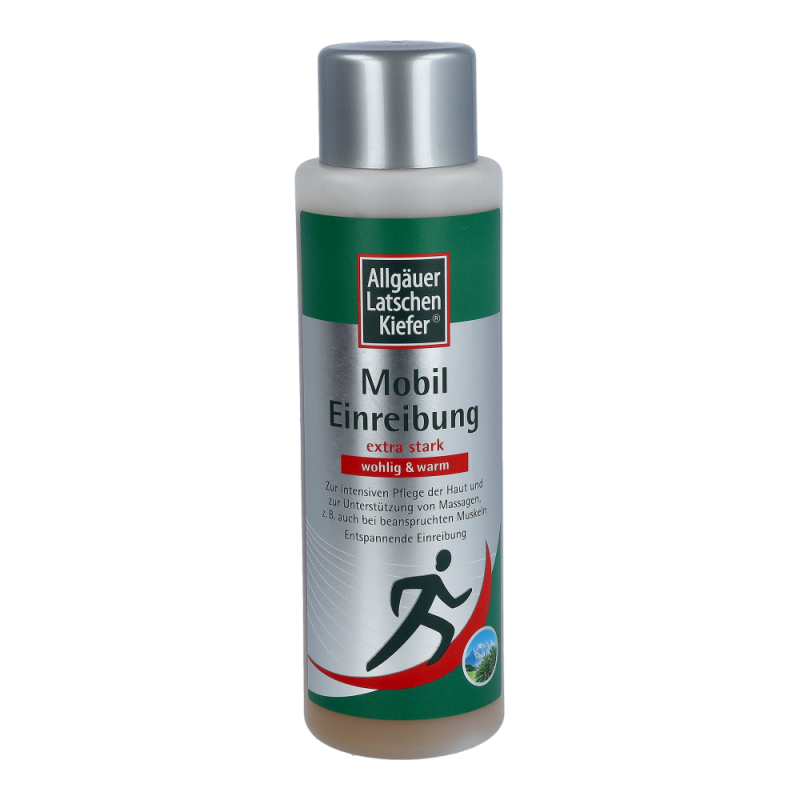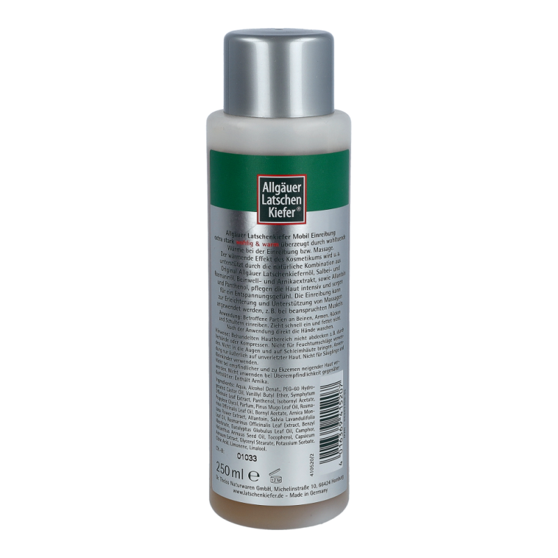 Allgäuer Latschenkiefer Einreibung Extra Stark überzeugt durch wohltuende Wärme bei der Einreibung. Der wärmende Effekt des Kosmetikums wird unterstützt durch die natürliche Kombination aus Original Allgäuer Latschenkiefernöl, Salbei- und Rosmarinöl. Beinwell- und Arnikaextrakt, sowie Allantoin und Panthenol pflegen die Haut