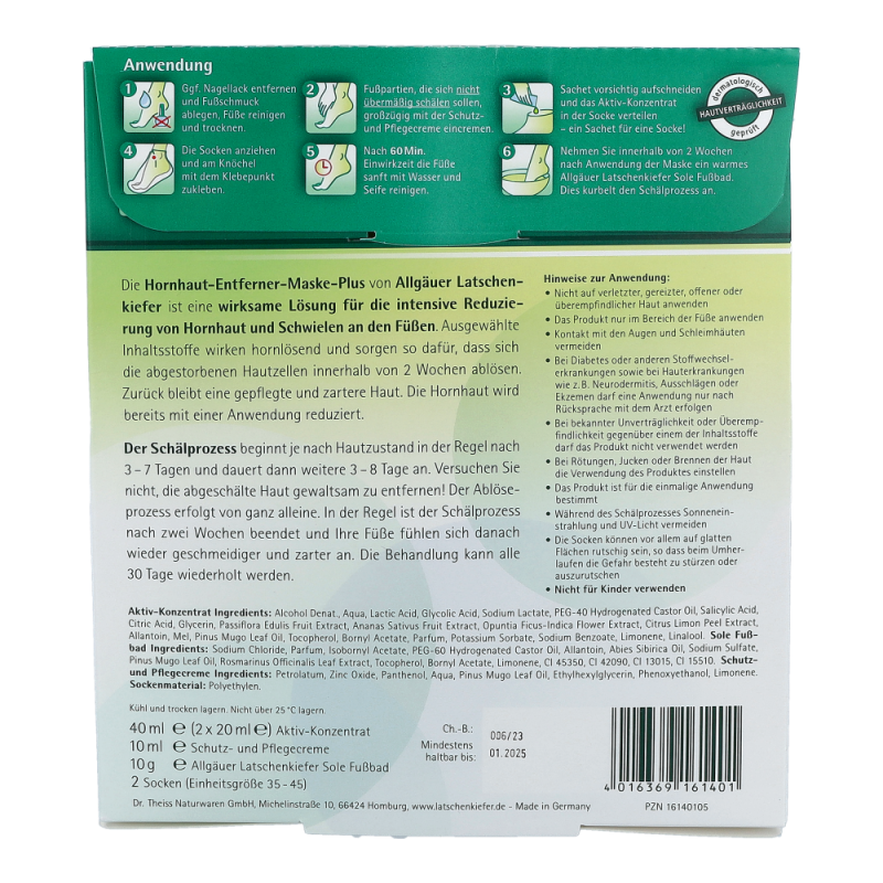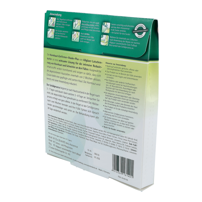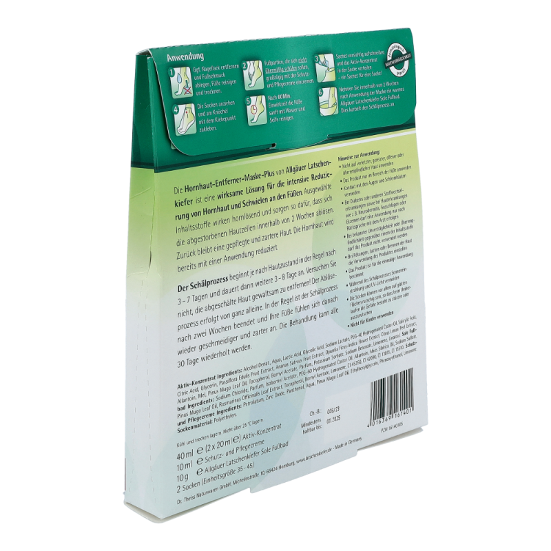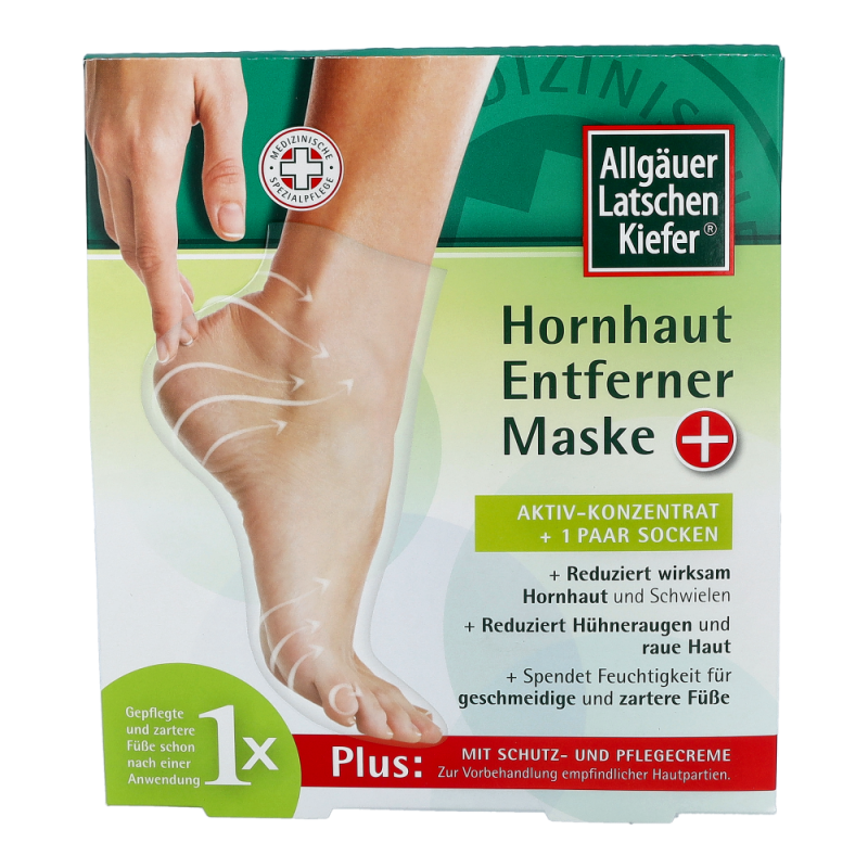 Allgäuer Latschenkiefer Hornhaut Entferner Maske schafft Abhilfe bei Schwielen und Hornhaut. Auch reduziert sie Hühneraugen, sowie raue Haut. Weiters spendet die Maske Feuchtigkeit und schenkt geschmeidige und zarte Füße.