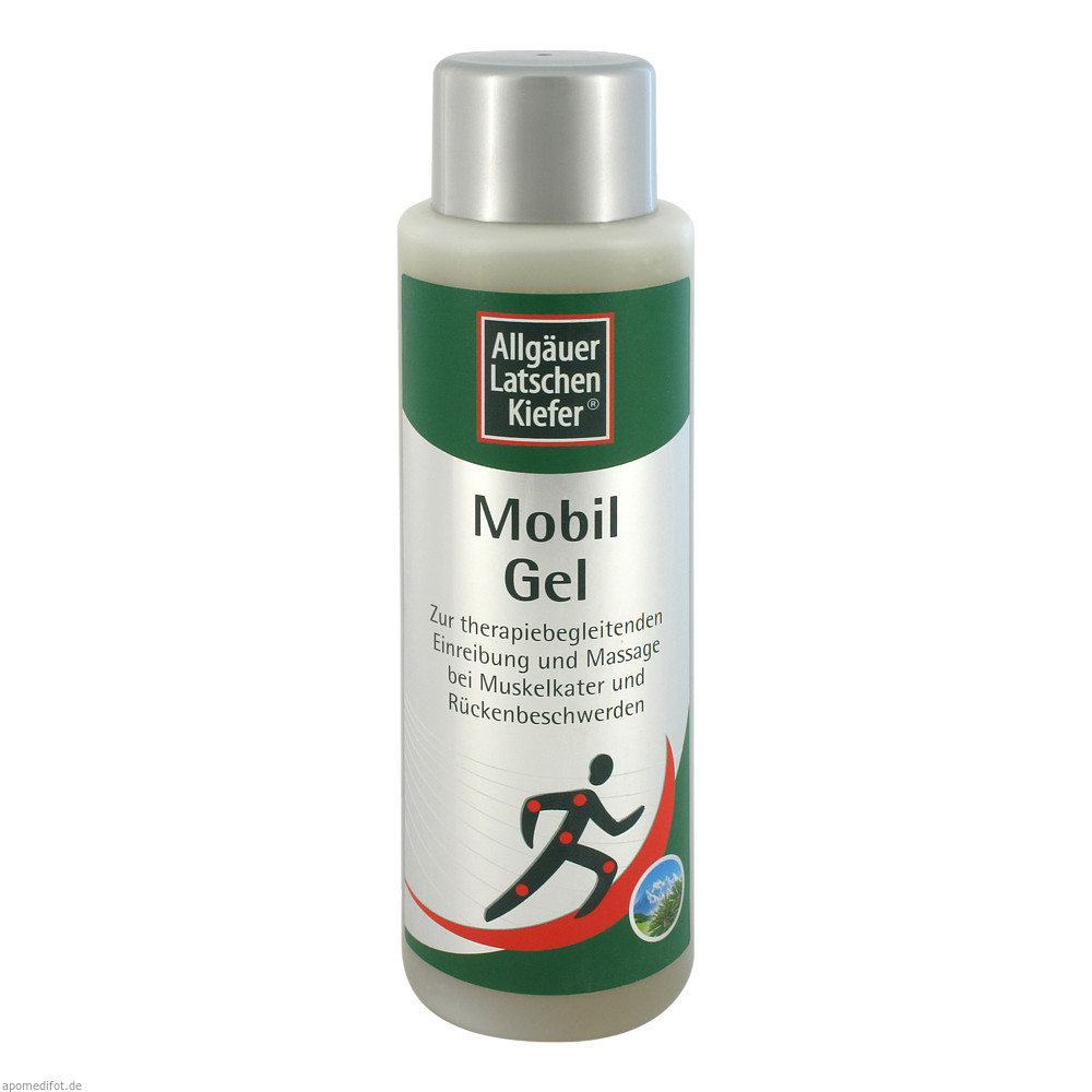 Allgäuer Latschenkiefer Mobil Gel st ein Spezialkosmetikum mit dem Original Allgäuer Latschenkiefernöl, wertvollem Beinwell- und Arnikaextrakt zur Einreibung und Massage. Das natürliche Pflege-Gel enthält zusätzlich eine Kombination aus Allantoin, Panthenol, Jojoba-, Salbei- und Rosmarinöl. Durch die Einreibung und Massage werden beanspruchte Muskeln entspannt.