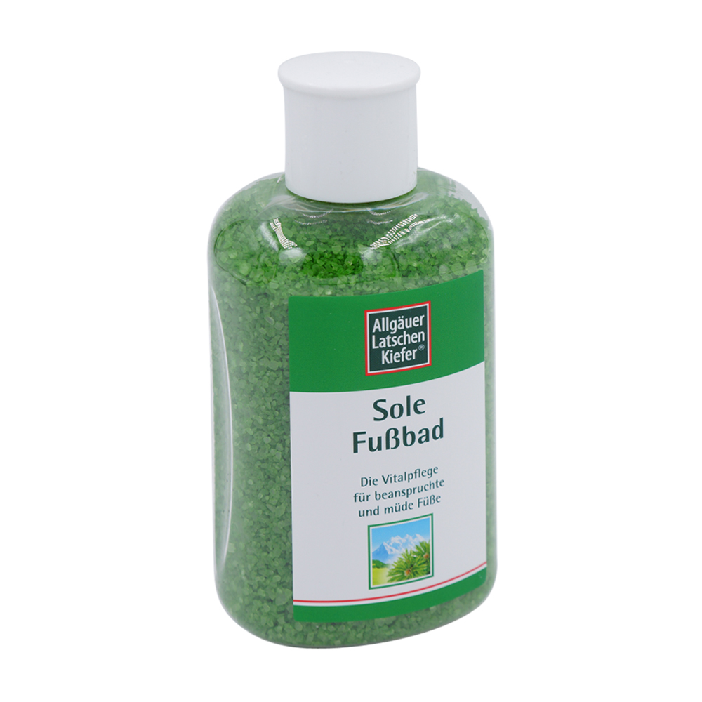Allgäuer Latschenkiefer Sole Fußbad besteht aus reinem Latschenkiefernöl und natürlichem Quell Solesalz und wirkt anregend für die Blutzirkulation. Beanspruchte, strapazierte Füße werden neu belebt und erhalten frische Kraft. Strapazierte Hautstellen werden sanft gereinigt und nachhaltig gepflegt. erhalten Sie dieses Produkt in den Packungsgrößen 100 g und 350 g.