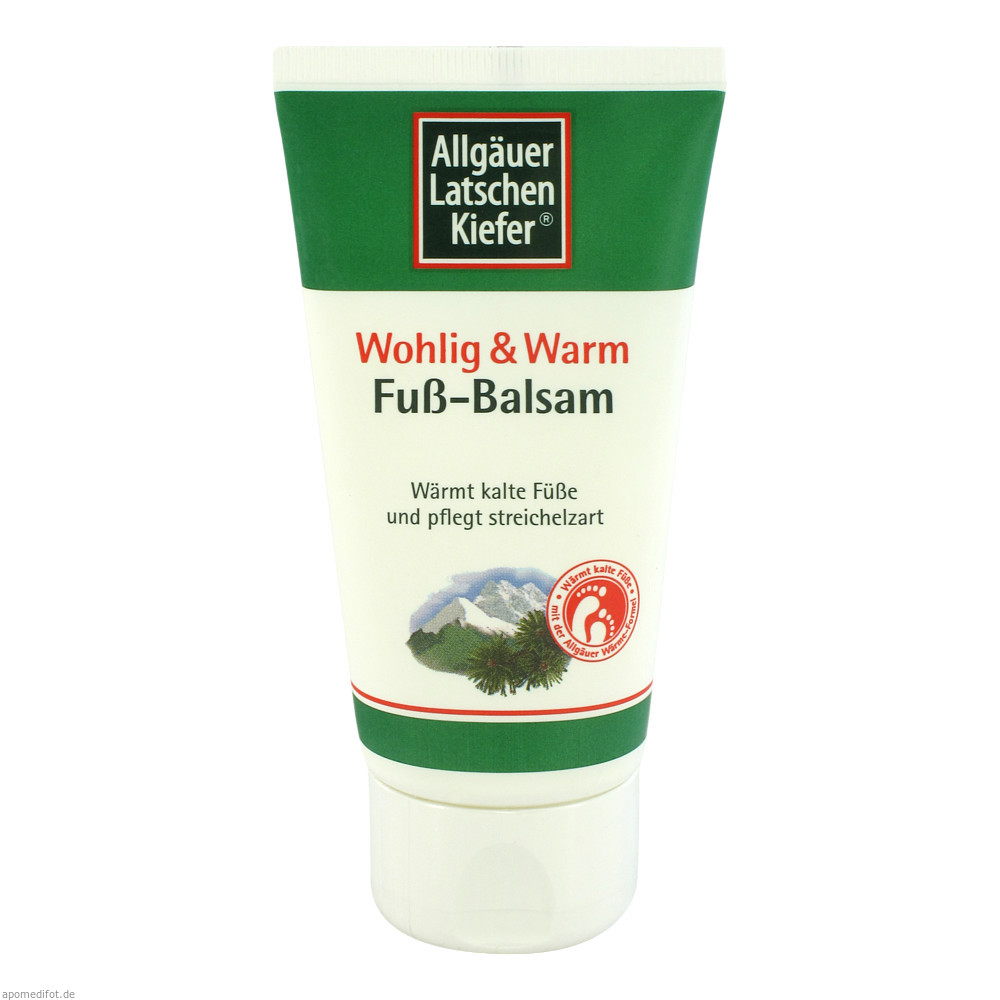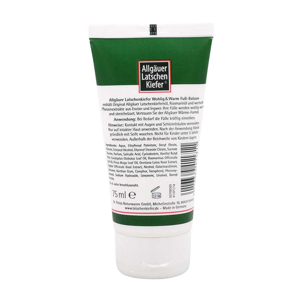 Allgäuer Latschenkiefer Wohlig & Warm Fußbalsam enthält Original Allgäuer Latschenkiefernöl, Rosmarinöl und wertvolle Pflanzenextrakte aus Enzian und Ingwer. Ihre Füße werden wohlig-warm und streichelzart.