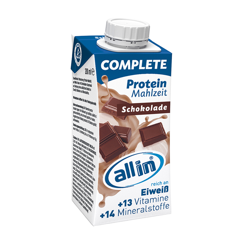 allin COMPLETE Schokolade ist eine Protein Mahlzeit (eiweißreiche Trinknahrung), die Dich mit 33% Prozent des Tagesbedarfs* an Eiweiß, 13 Vitaminen und 14 Mineralstoffen versorgt.