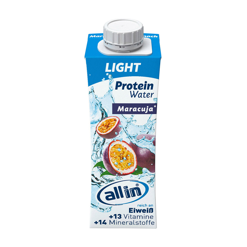 allin LIGHT Maracuja ist ein Protein Water (Eiweiß-Getränk) auf Wasserbasis mit Kollagen Eiweiß, das Dich mit 33% Prozent des Tagesbedarfs* an Eiweiß, 13 Vitaminen und 14 Mineralstoffen versorgt.