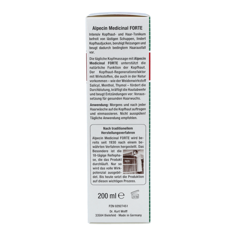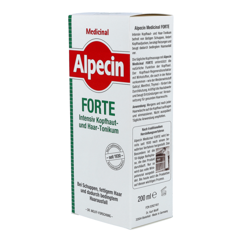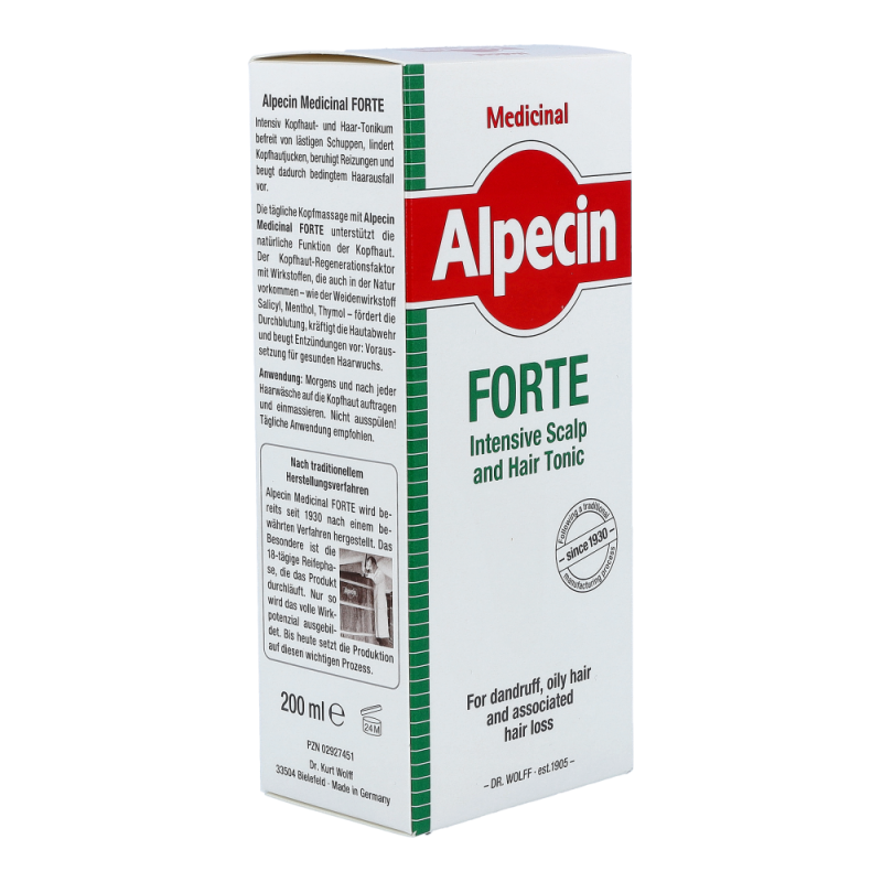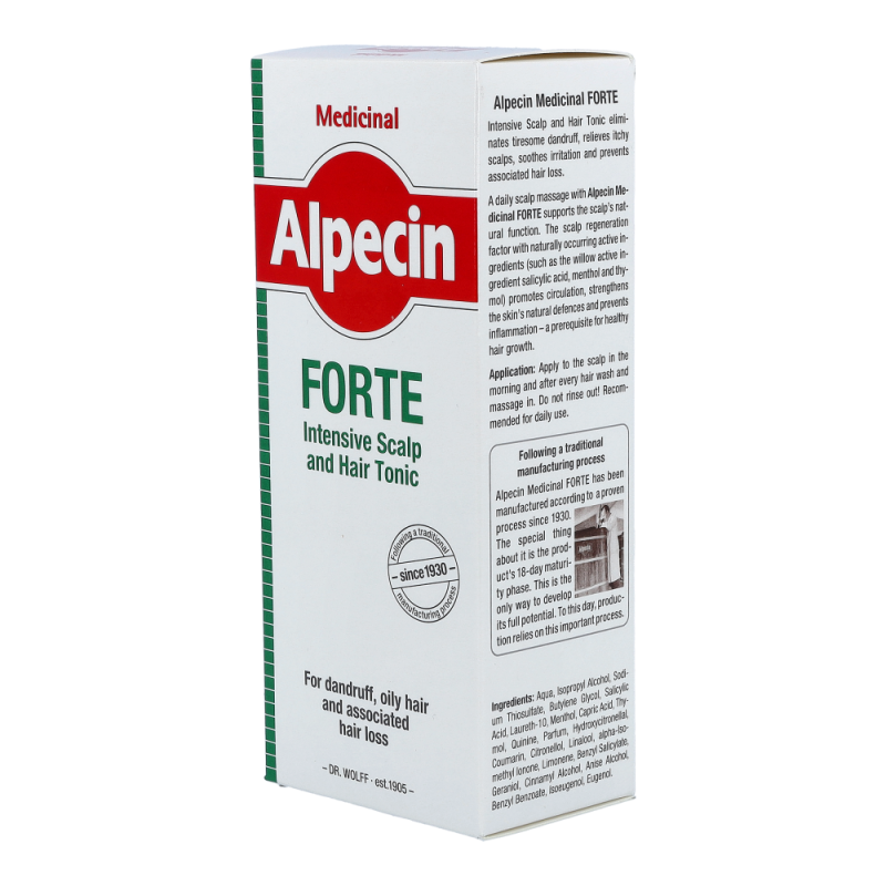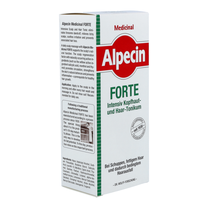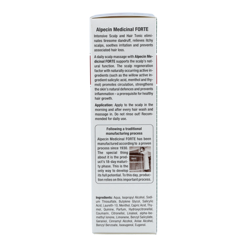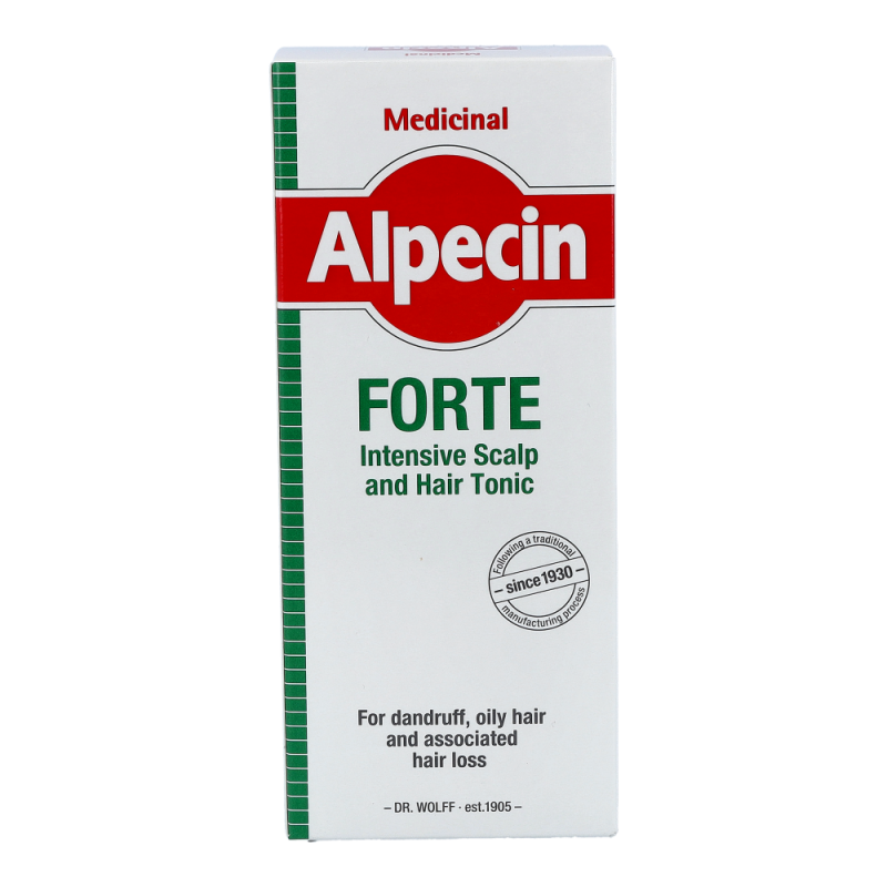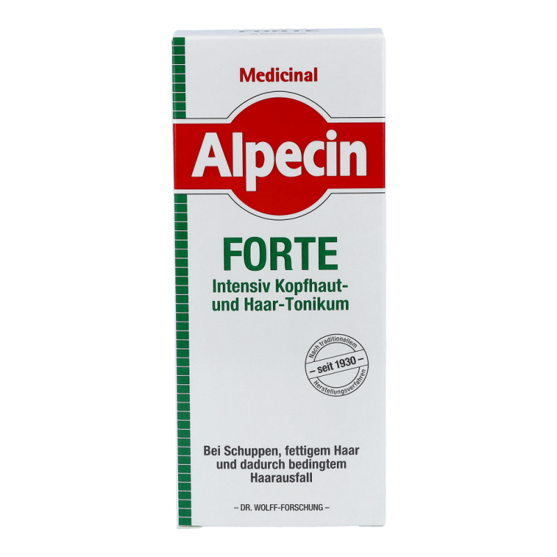 Alpecin Med Haarwasser Forte zur täglichen Anwendung als Basispflege bei Schuppen, fettigem Haar und dadurch bedingtem Haarausfall. Der Multikomplex mit Wirkstoffen wie Salicyl, Menthol und Thymol fördert zudem die Durchblutung und kräftigt die Hautabwehr. Wirkt bis zu 24 Stunden, weil das Tonikum auf der Kopfhaut verbleibt und dort ein Wirkstoff-Depot bildet.