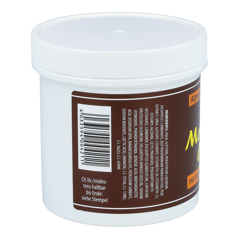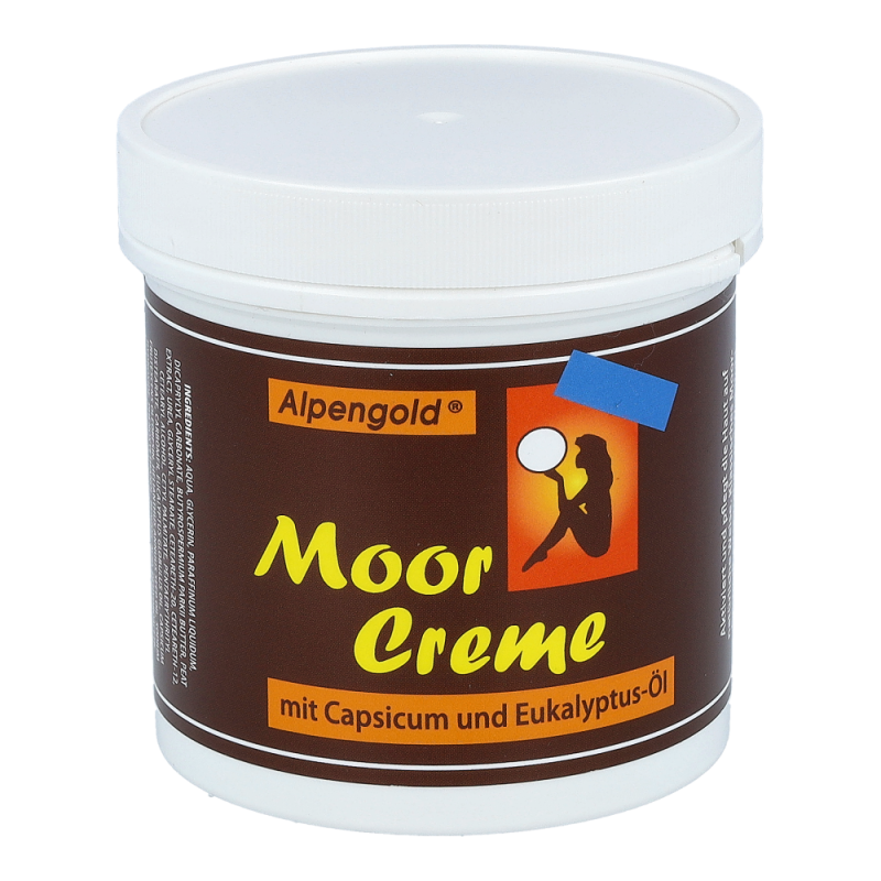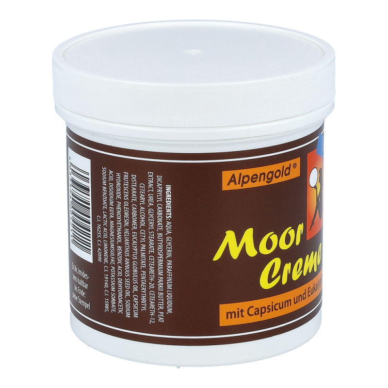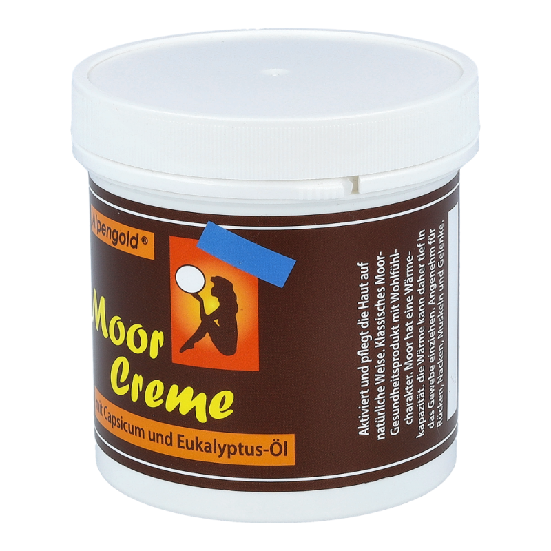 Alpengold Moor Creme aktiviert und pflegt die Haut auf natürliche Weise. Moor hat eine Wärmekapazität, die Wärme kann daher tief in das Gewebe einziehen. Angenehm für Rücken, Nacken, Muskeln und Gelenke.