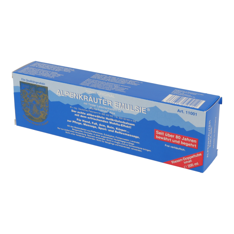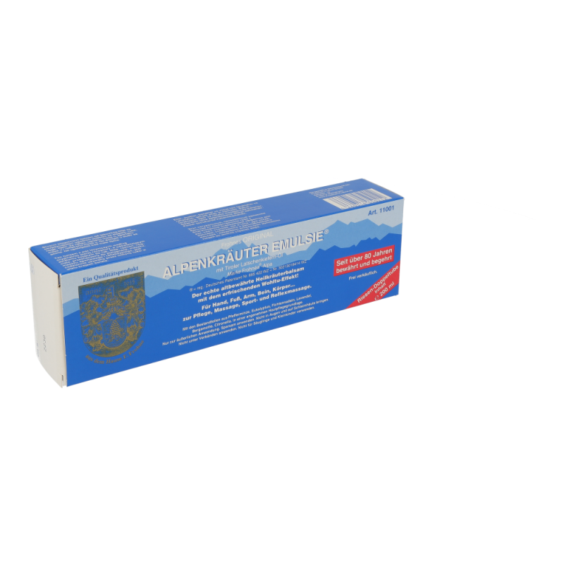 Alpenkräuter Emulsion ist ein bewährtes Pflegemittel auf rein pflanzlicher Basis, das in keiner Hausapotheke fehlen sollte. Diese Pflegeemulsion kann universell für trockene und belastete Haut zum Einreiben verwendet werden. Sehr ergiebig – auch für größere Hautpartien eine Wohltat. Dieses Produkt erhalten Sie in den Packungsgrößen 100 g und 200 g.