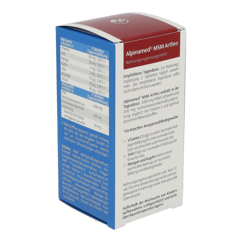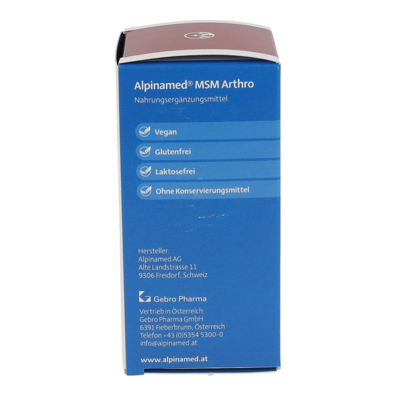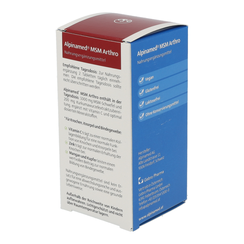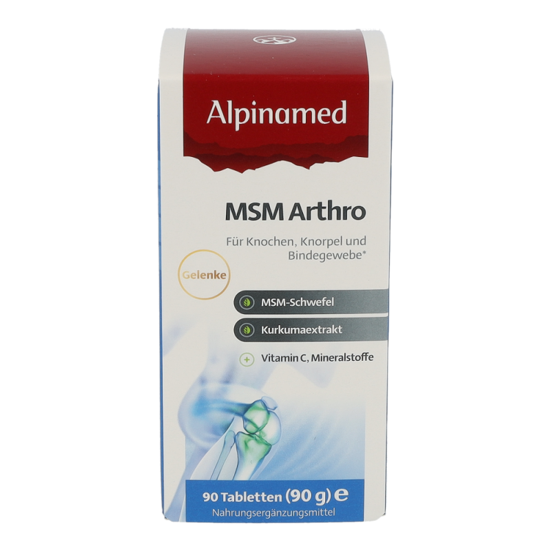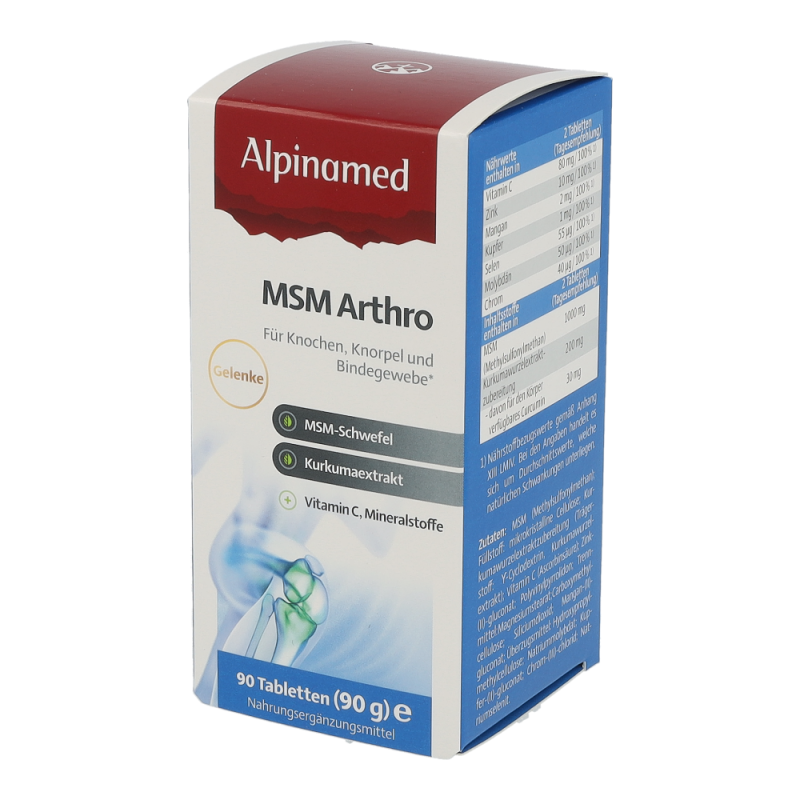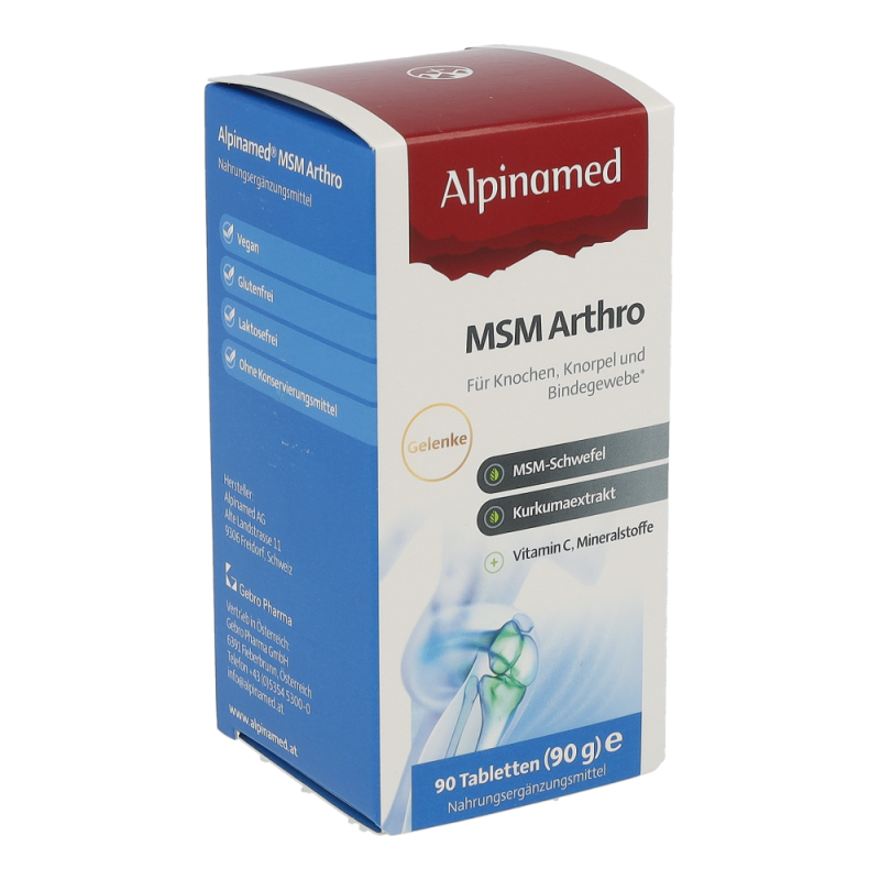 Der Mineralstoff Schwefel ist essentiell für den menschlichen Organismus. MSM (Methyl-Sulfonyl-Methan) liefert dem Körper wichtige Schwefelverbindungen, die ein Bestandteil von gesunden Gelenken, Knorpeln, Knochen, Haut und Haaren sind. Für seinen Einsatz als Nahrungsergänzungsmittel ist entscheidend, dass auf äußerste Reinheit geachtet wird. Alpinamed® MSM Arthro wird in einem 4-stufigen Destillationsverfahren hergestellt und ist über 99,9 % rein. Somit hat unser verwendeter MSM-Schwefel die höchste Reinheitsstufe. Ideal ergänzt wird MSM mit Molybdän, welches die Verstoffwechslung schwefelhaltiger Verbindungen unterstützt.Nützen können Sie den positiven Beitrag von MSM-Schwefel in Form der neuen Alpinamed® MSM Arthro Tabletten..