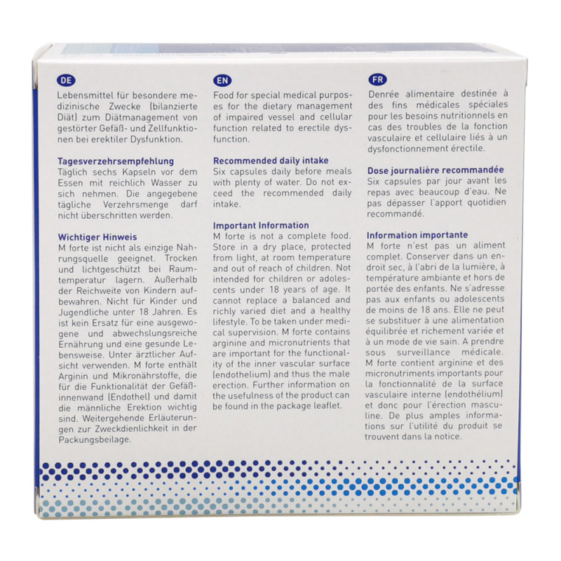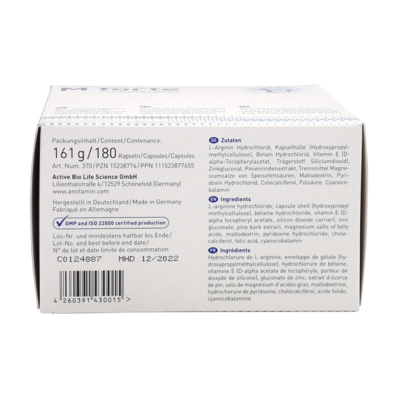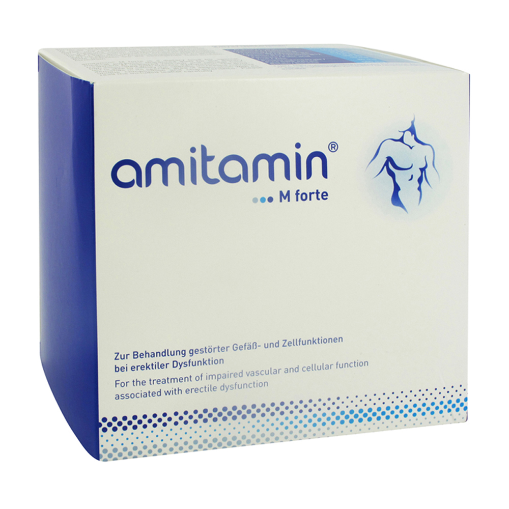 amitamin M forte ist eine ergänzende bilanzierte Diät zum Diätmanagement von gestörten Gefäß- und Zellfunktionen bei erektiler Dysfunktion. Die M-forte Formel enthält neben L-Arginin und Pinienrindenextrakt sieben weitere Mikronährstoffe, die u.a. einen Beitrag zum Abbau des gefäßschädigenden Homocystein (Vitamine B6, B12, Folsäure und Biotin) leisten und für einen gesunden Testosteronspiegel (Zink) notwendig sind..