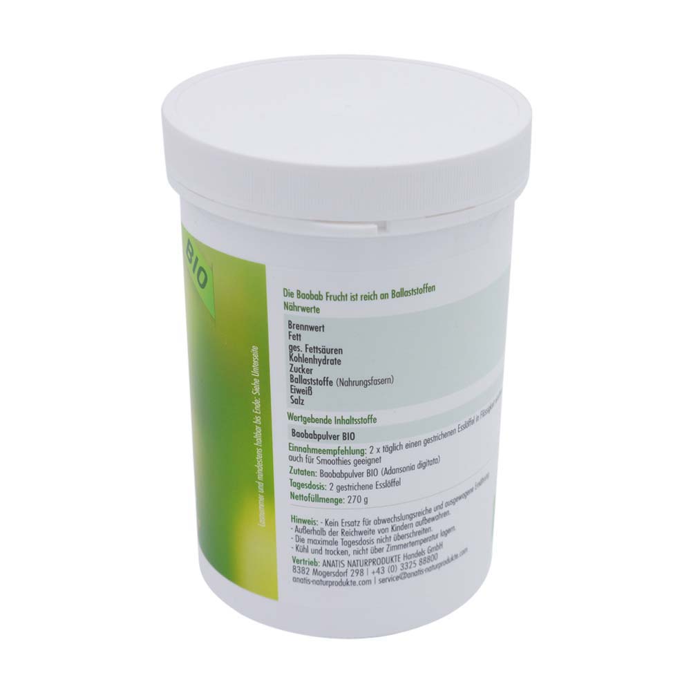 Anatis Baobab-Pulver ist ein wahres Superfood, das reich an Vitamin C, Eisen, antioxidativen Polyphenolen und zahlreichen weiteren Vitalstoffen ist. Wissenschaftliche Untersuchungen zeigen außerdem, dass der Verzehr von Baobab-Pulver eine präbiotische Wirkung hat und somit Beschwerden wie das Reizdarm-Syndrom lindern kann.