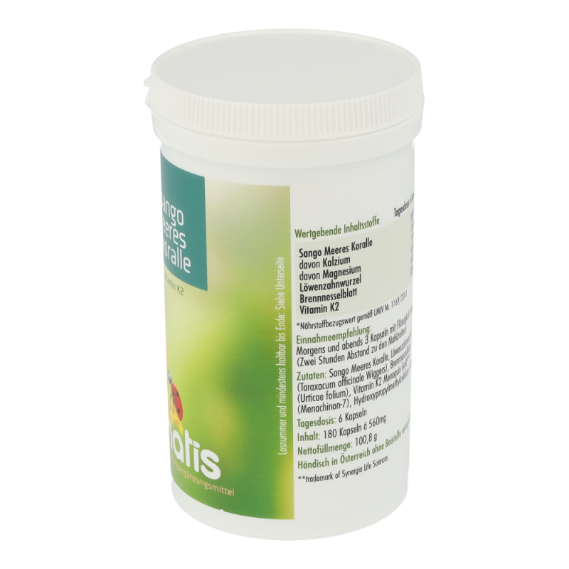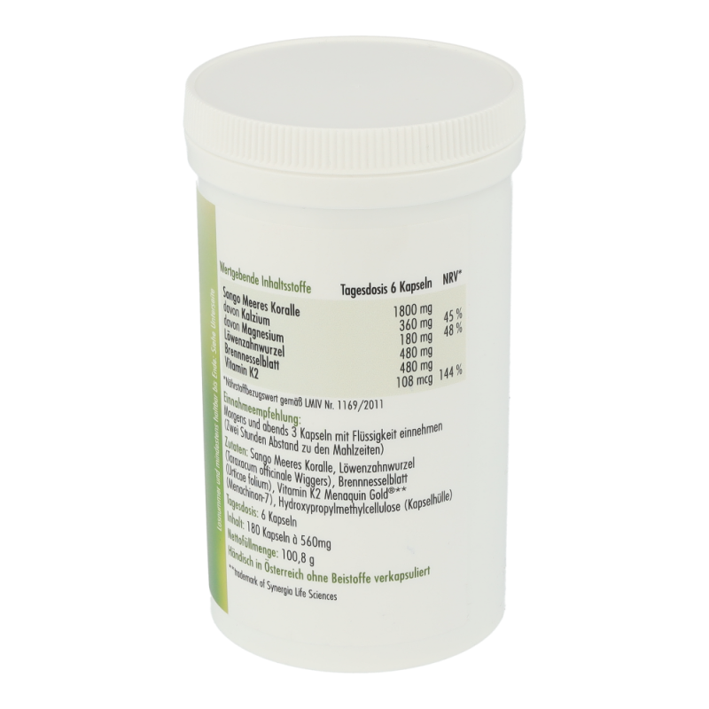 Die Sango-Koralle liefert ionisiertes, organisches Kalzium und Magnesium in einer besonders gut aufgenommenen Form. Dieses reine Naturprodukt aus den Gewässern Okinawas wird mit Kräutern wie Löwenzahn und Brennnessel kombiniert. Zusätzlich ist Vitamin K2 enthalten, das eine wertvolle Ergänzung zu Kalziumquellen darstellt.