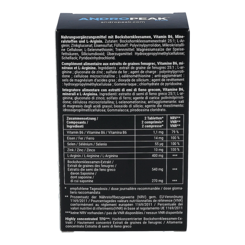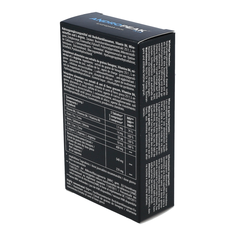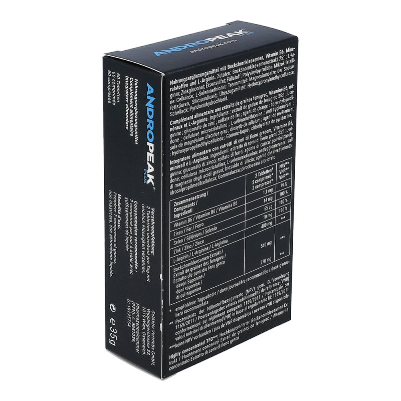 ANDROPEAK® Plus besteht aus den bewährten hochwertigen Extrakten aus Bockshornkleesamen und einem Plus an L-Arginin. Die positiven Eigenschaften des Bockshornklees werden durch die durchblutungsfördernde Wirkung von L-Arginin zusätzlich unterstützt.
