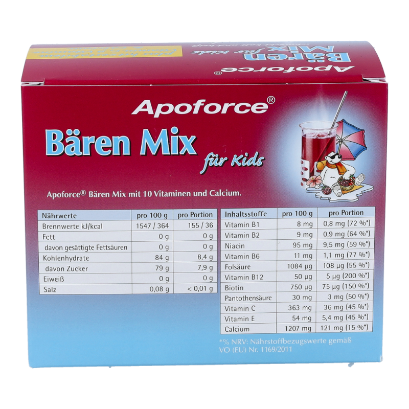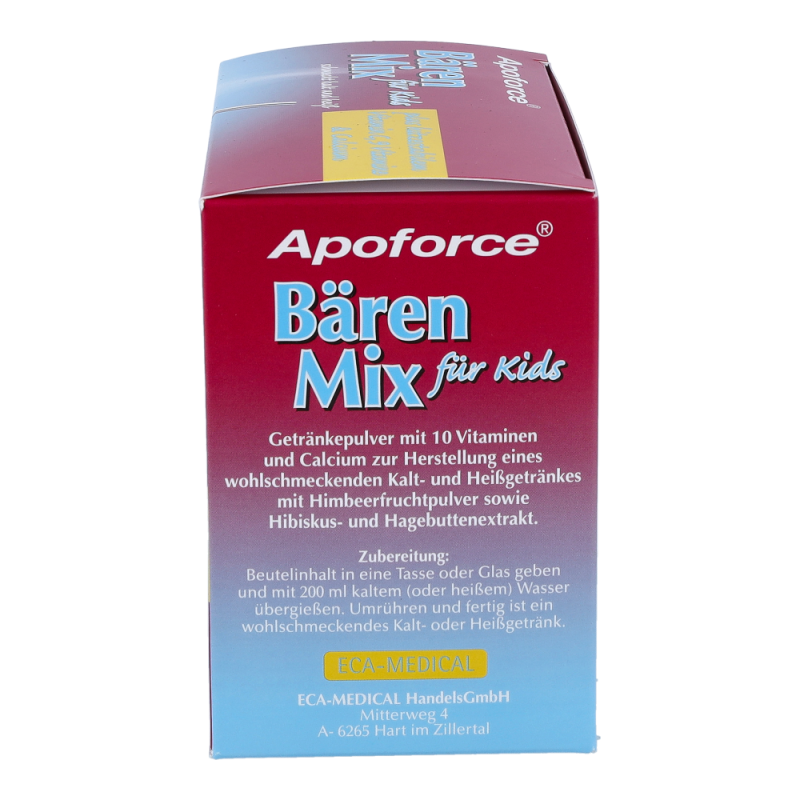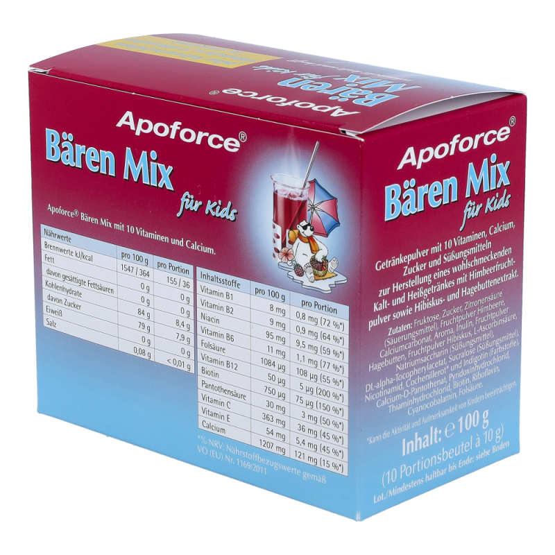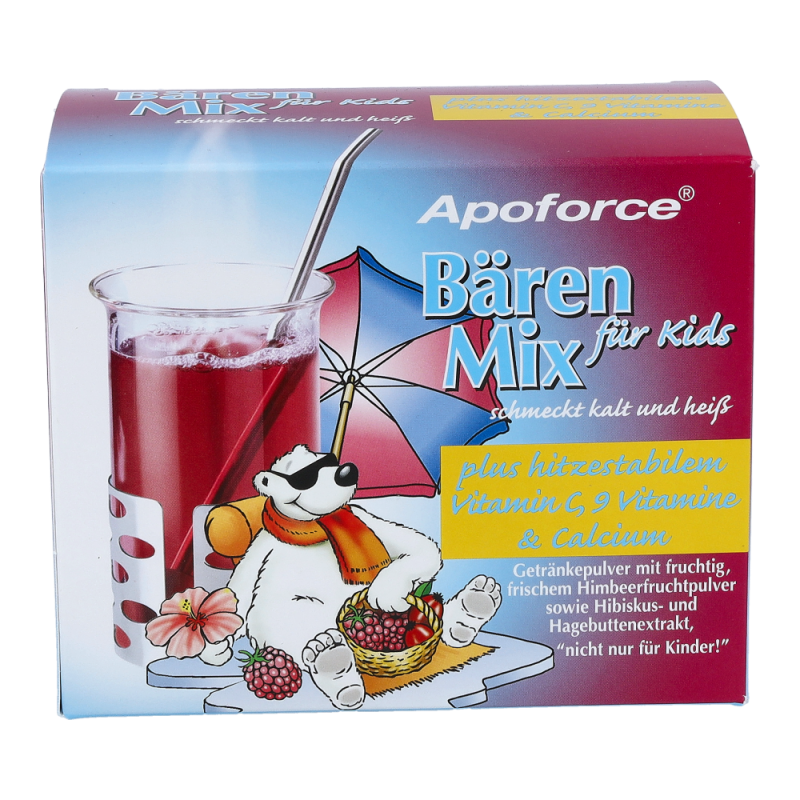 Apoforce Bärenmix für Kids schmeckt heiß und kalt! Mit Himbeersaftpulver sowie Hibiskus- und Hagebuttenextrakt – nicht nur für Kinder! Beinhaltet Calcium und 10 Vitamine.