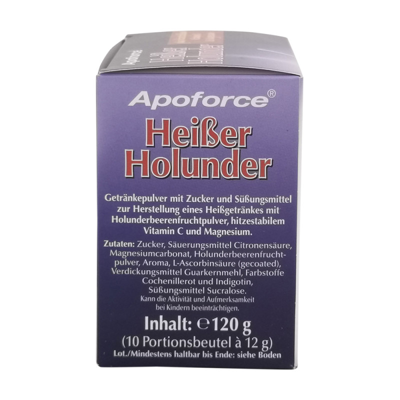 Apoforce Sachets Heißer Holunder sind die Basis für ein Heißgetränk mit dem fruchtigen Saftpulver von Holunderbeeren. Die Inhaltsstoffe Vitamin C und Magnesium wirken wohltuend auf den Körper.