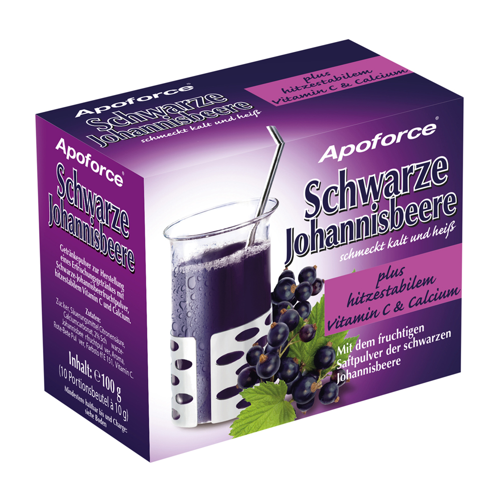 Apoforce Schwarze Johannisbeere 10 g Sachets schmecken kalt und heiß. Der fruchtige Geschmack dieses Getränkes liegt an dem fruchtigen Saftpulver der schwarzen Johannisbeere. Plus Vitamin C und Calcium.