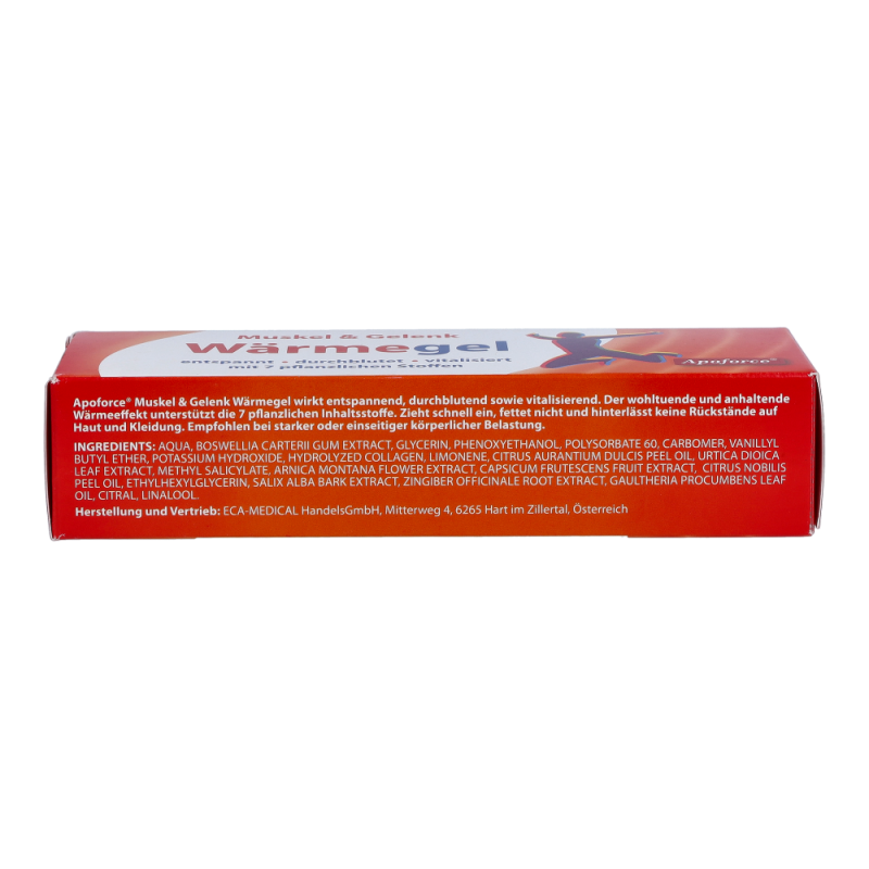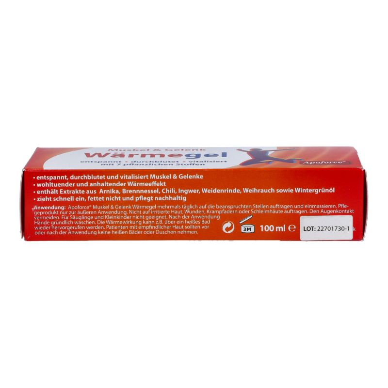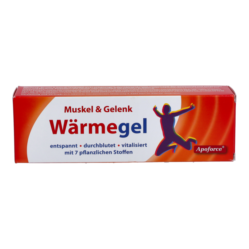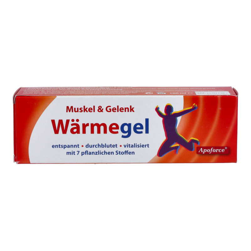Apoforce Wärmegel dient zur äußeren Anwendung bei verspannter Muskulatur, Muskelkater und beanspruchten Gelenken. Das Gel wirkt entspannend, durchblutet sowie vitalisierend. Zudem zieht sie schnell ein, fettet nicht und hinterlässt keine Rückstände auf Haut und Kleidung. Empfohlen bei starker oder einseitiger körperlicher Belastung.