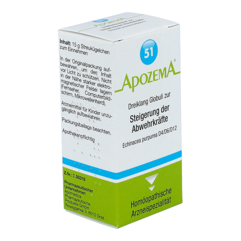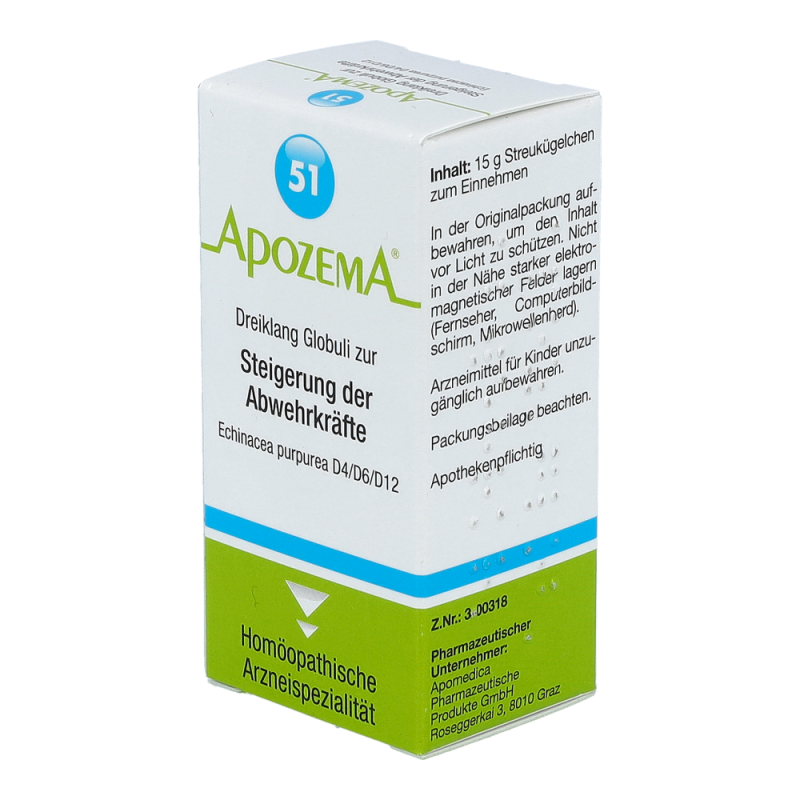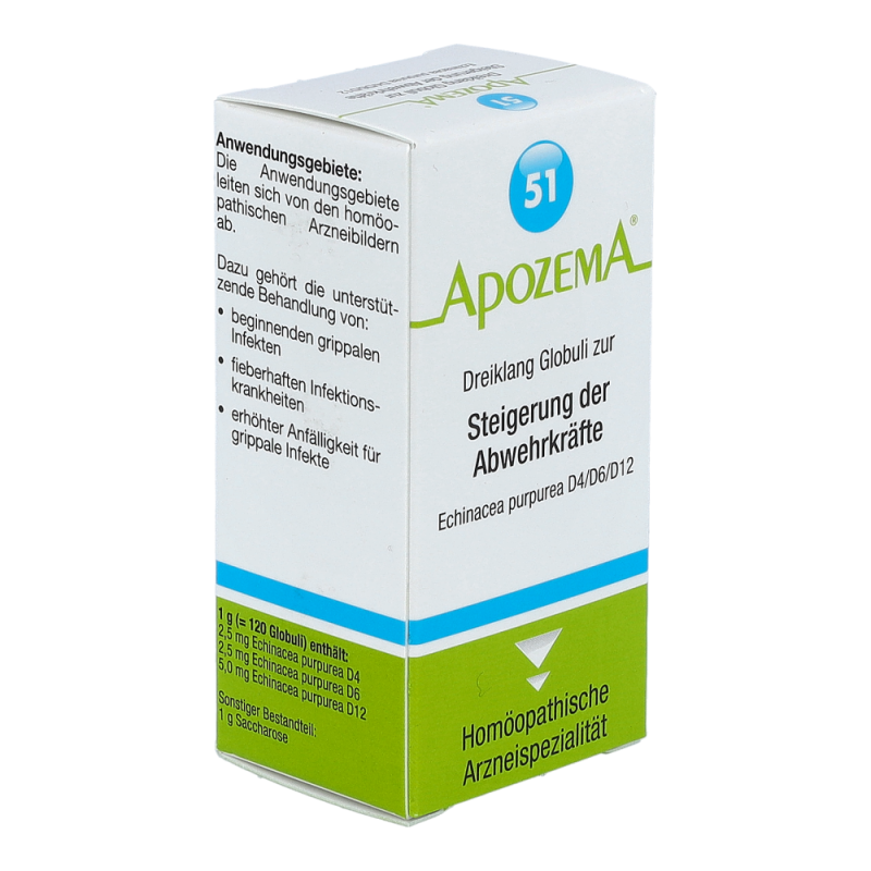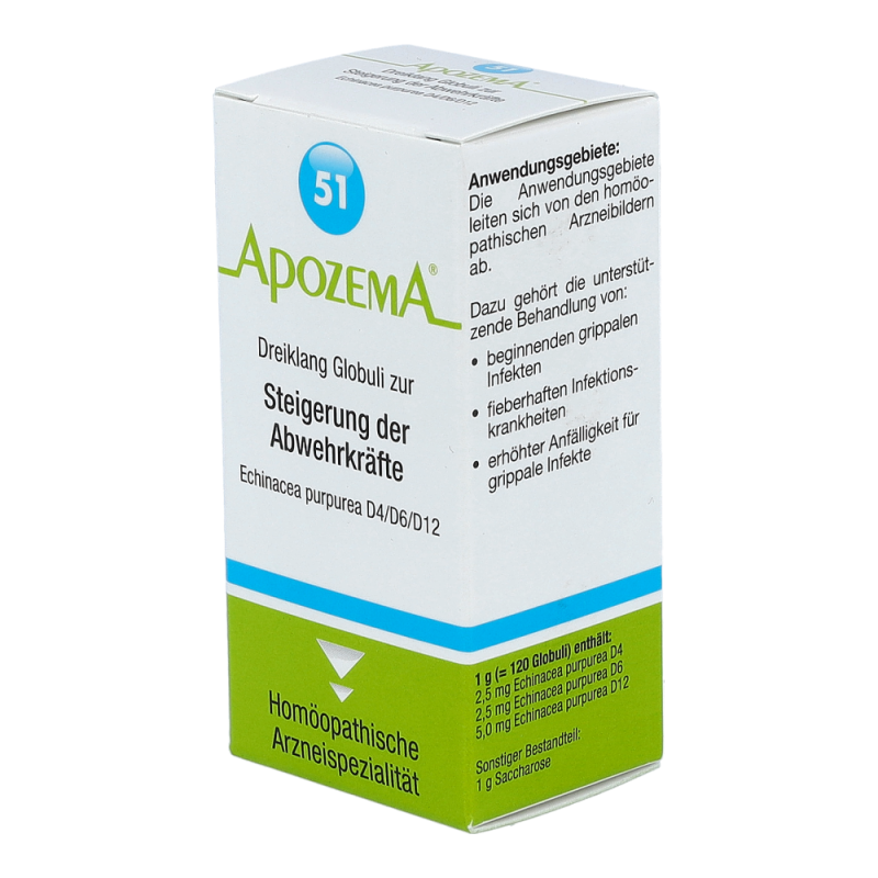 Apozema Dreiklang Globuli Nr. 51 zur Steigerung der Abwehrkräfte dient zur Vorbeugung grippaler Infekte. Darüber hinaus wird das Mittel auch bei gehäuftem Auftreten grippaler Infekte sowie vor der kalten Jahreszeit angewendet. Der enthaltene Rote Sonnenhut dient zudem zur Steigerung und Stärkung der körpereigenen Abwehrkräfte sowie zur Unterstützung bei Atemwegsinfekten.