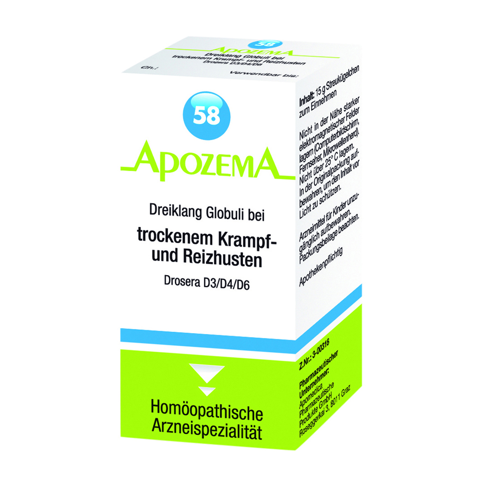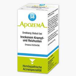 Apozema Dreiklang Globuli Nr. 58 Drosera wird bei trockenem und quälendem Krampf- und Reizhusten sowie tiefem, bellendem Husten angewendet. Darüber hinaus wirkt das Mittel auch bei schmerzhaften Hustenanfällen sowie nächtlichen Hustenkrämpfen. Sonnentau (Drosera) wirkt hustenstillend, schleim- und krampflösend auf die Bronchien und wird daher bei krampfartigem Husten und Reizhusten eingesetzt.