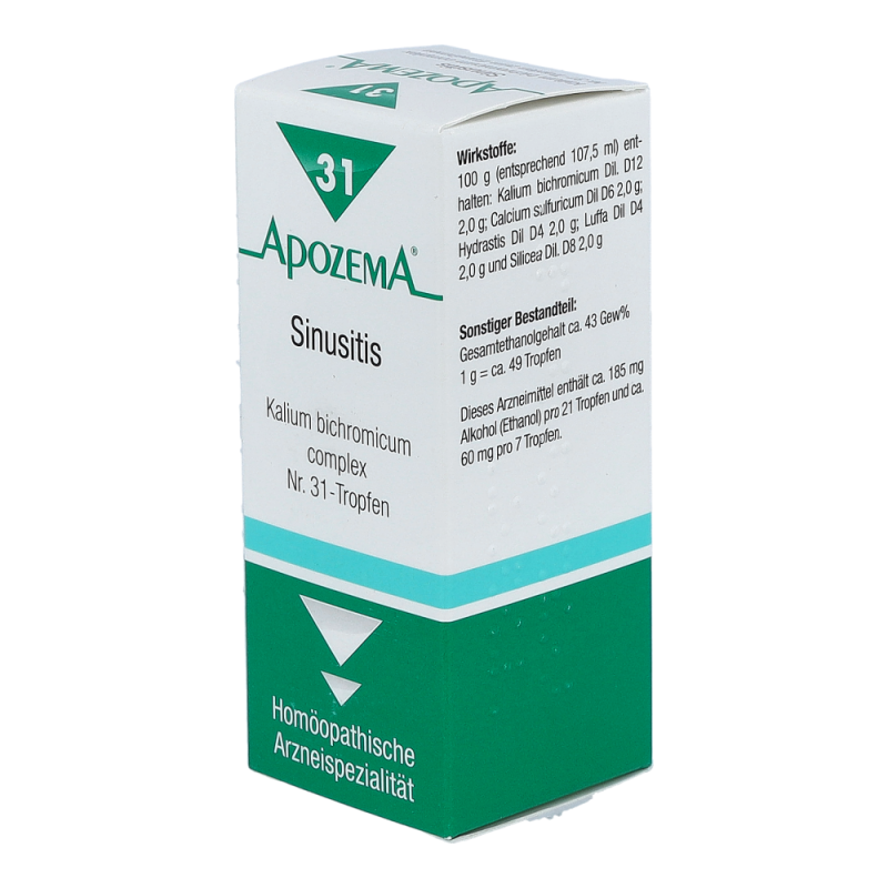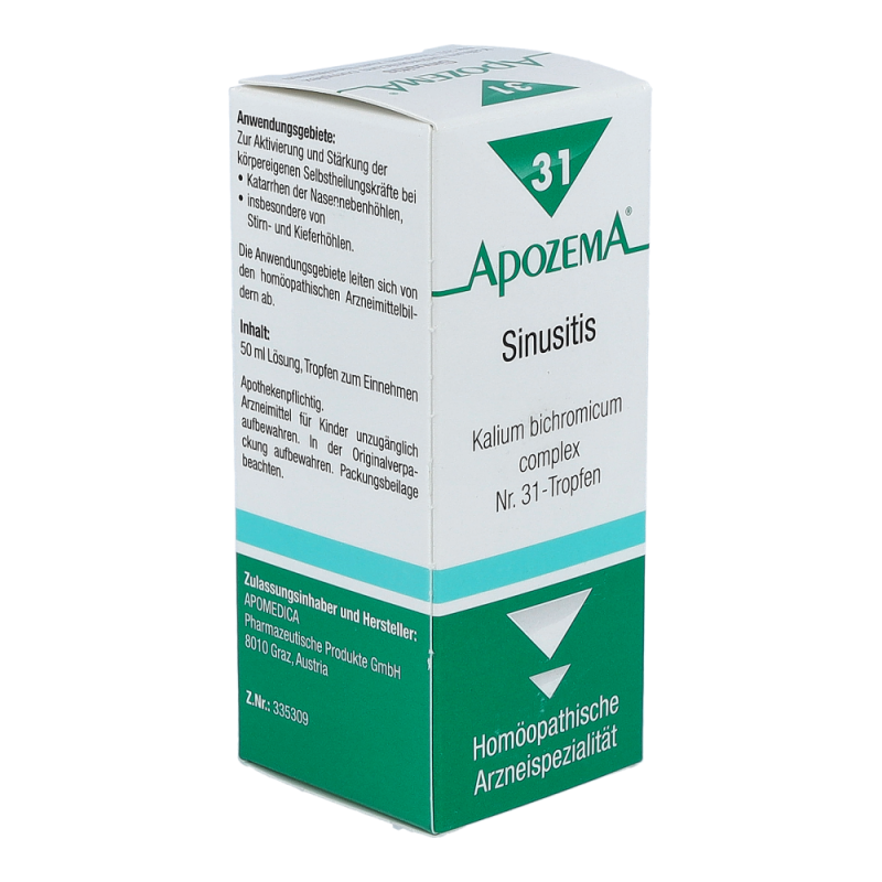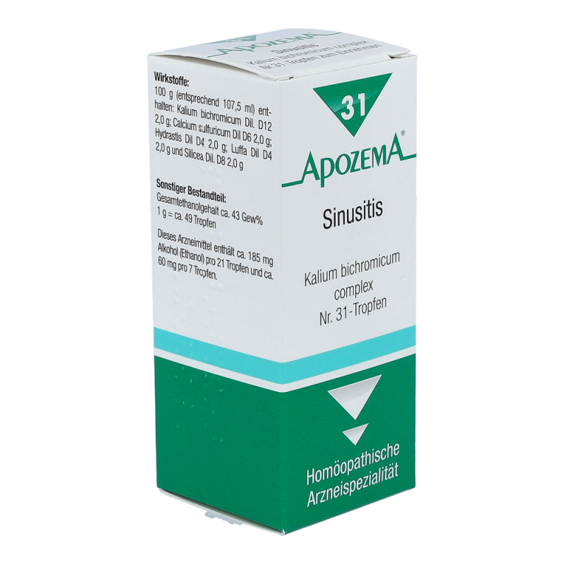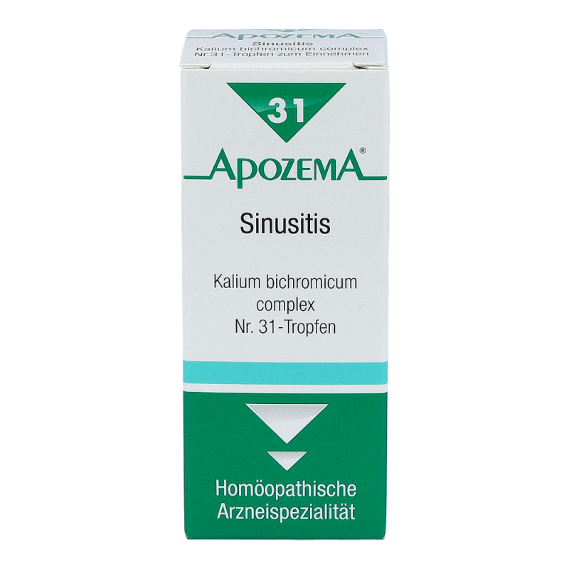 Apozema Sinusitis-Tropfen Nr. 31 von APOMEDICA regen die Selbstheilungskräfte gemäß dem homöopathischen Arzneimittelbild bei Entzündungen der Nasennebenhöhlen insbesondere von Stirn- und Kieferhöhlen an