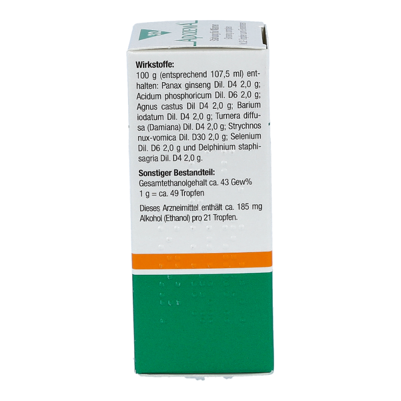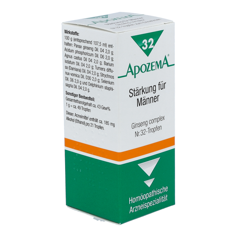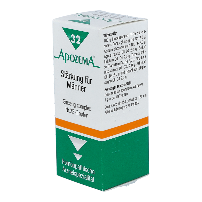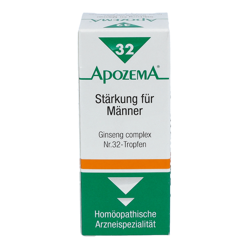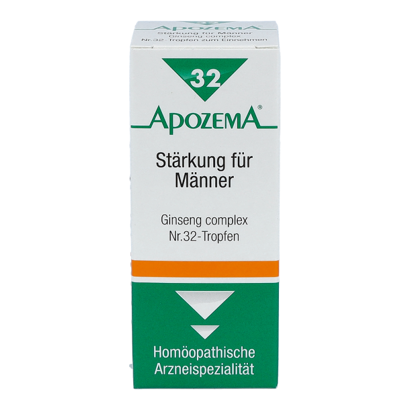Apozema Nr. 32 Stärkungs-Tropfen für Männer regen die Selbstheilungskräfte gemäß dem homöopathischen Arzneimittelbild bei Potenzstörungen, nervlicher Erschöpfung, Altersbeschwerden und allgemeiner Schwäche an..